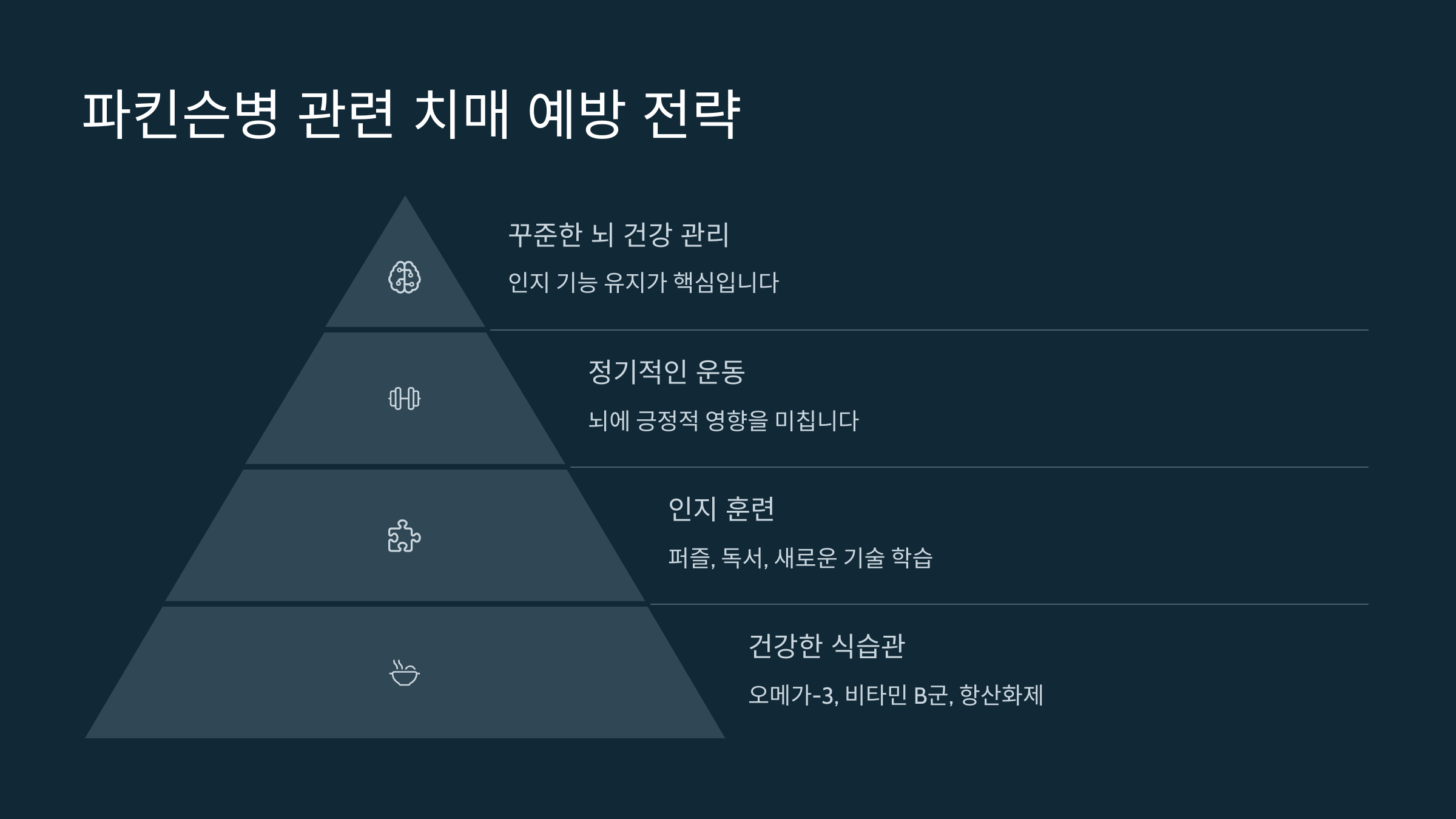 파킨슨병과 치매의 관계를 이해하고 예방하는 방법을 찾는 것이 중요합니다. 가장 기본적인 예방 전략은 꾸준한 뇌 건강 관리입니다. 정기적인 운동은 뇌에 긍정적인 영향을 미쳐 치매의 발생 위험을 줄이는 데 도움이 됩니다. 또한, 인지 훈련을 통해 뇌를 활성화시키는 것도 중요합니다. 퍼즐, 독서, 새로운 기술 학습 등은 인지 기능을 유지하는 데 도움이 됩니다. 또한, 건강한 식습관도 치매 예방에 중요한 역할을 합니다. 오메가-3 지방산, 비타민 B군, 항산화제 등이 풍부한 식단은 뇌 건강을 지원할 수 있습니다.