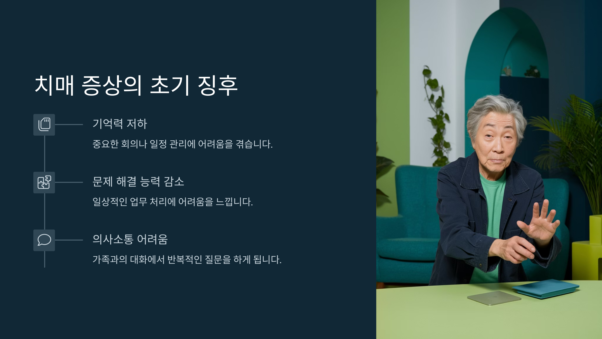 치매는 초기 단계에서 눈에 띄지 않을 수 있지만, 주의 깊게 관찰하면 몇 가지 증상이 나타날 수 있습니다. 초기에는 기억력 저하와 함께 문제 해결 능력의 감소가 나타날 수 있으며, 점차 의사소통에 어려움을 겪거나 일상적인 업무를 처리하는 데 어려움을 느낄 수 있습니다. 예를 들어, 직장에서는 중요한 회의나 일정 관리에 어려움을 겪거나, 가족과의 대화에서 반복적인 질문을 하게 되는 경우가 많습니다. 이러한 증상은 초기 치매의 신호일 수 있으므로, 빠르게 전문가의 도움을 받는 것이 중요합니다.