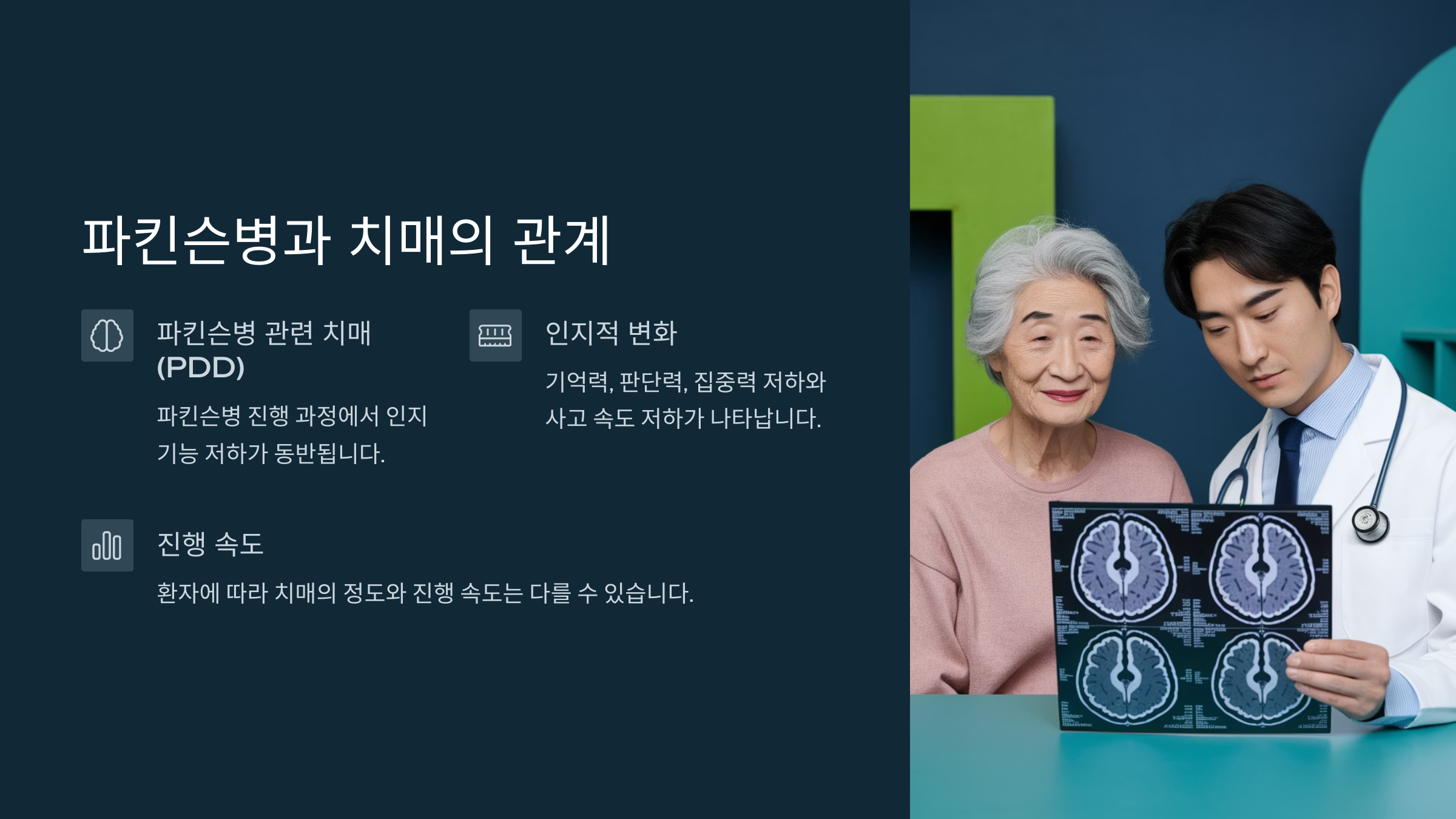 파킨슨병은 주로 운동 증상으로 알려져 있지만, 그 진행 과정에서 인지 기능의 저하를 동반하는 경우가 많습니다. 파킨슨병 환자들 중 일부는 시간이 지나면서 치매 증상도 경험하게 되며, 이는 '파킨슨병 관련 치매(PDD, Parkinson's Disease Dementia)'로 불립니다. PDD는 기억력, 판단력, 집중력의 저하뿐만 아니라 사고 속도 저하 등 다양한 인지적 변화를 초래할 수 있습니다. 환자에 따라 치매의 정도와 진행 속도는 다를 수 있지만, 대부분의 경우 파킨슨병의 증상이 악화되면서 치매 증상도 함께 나타납니다.