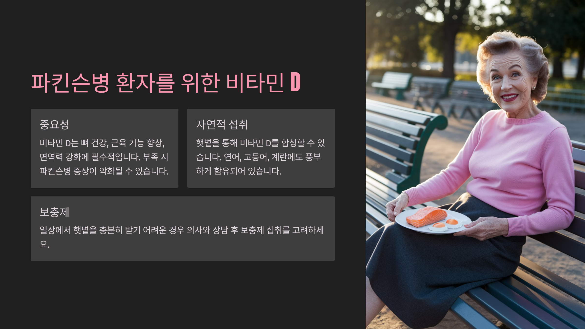 비타민 D는 파킨슨병 환자에게 매우 중요한 역할을 합니다. 비타민 D는 뼈 건강을 돕고, 근육 기능을 향상하며, 면역력을 강화하는 데 필수적인 영양소입니다. 또한, 비타민 D의 부족은 파킨슨병 증상을 악화시킬 수 있다는 연구 결과가 있습니다. 자연적인 방법으로는 햇볕을 통해 비타민 D를 합성할 수 있지만, 일상에서 햇볕을 충분히 받기 어려운 경우에는 비타민 D가 포함된 보충제를 섭취하는 것이 필요할 수 있습니다. 비타민 D가 풍부한 음식으로는 연어, 고등어, 계란 등이 있습니다.
