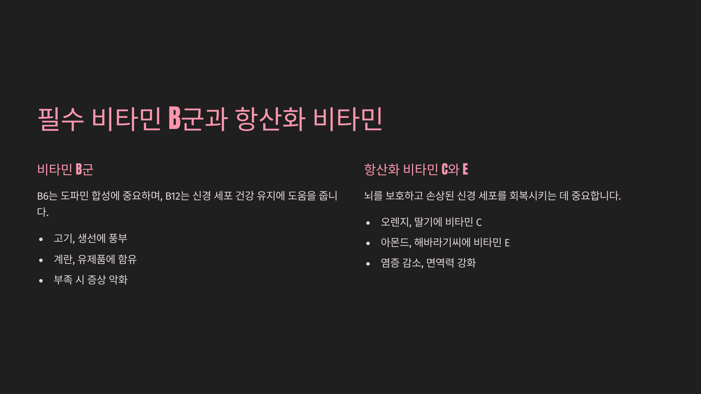 파킨슨병 환자들에게 비타민 B군, 특히 B6와 B12는 매우 중요합니다. 비타민 B6는 도파민 합성에 중요한 역할을 하며, 비타민 B12는 신경 세포의 건강을 유지하는 데 도움을 줍니다. 비타민 B군이 부족하면 파킨슨병 증상이 악화될 수 있으므로, B6와 B12가 풍부한 음식을 섭취하는 것이 좋습니다. 특히, 고기, 생선, 계란, 유제품 등에서 비타민 B군을 충분히 섭취할 수 있습니다.