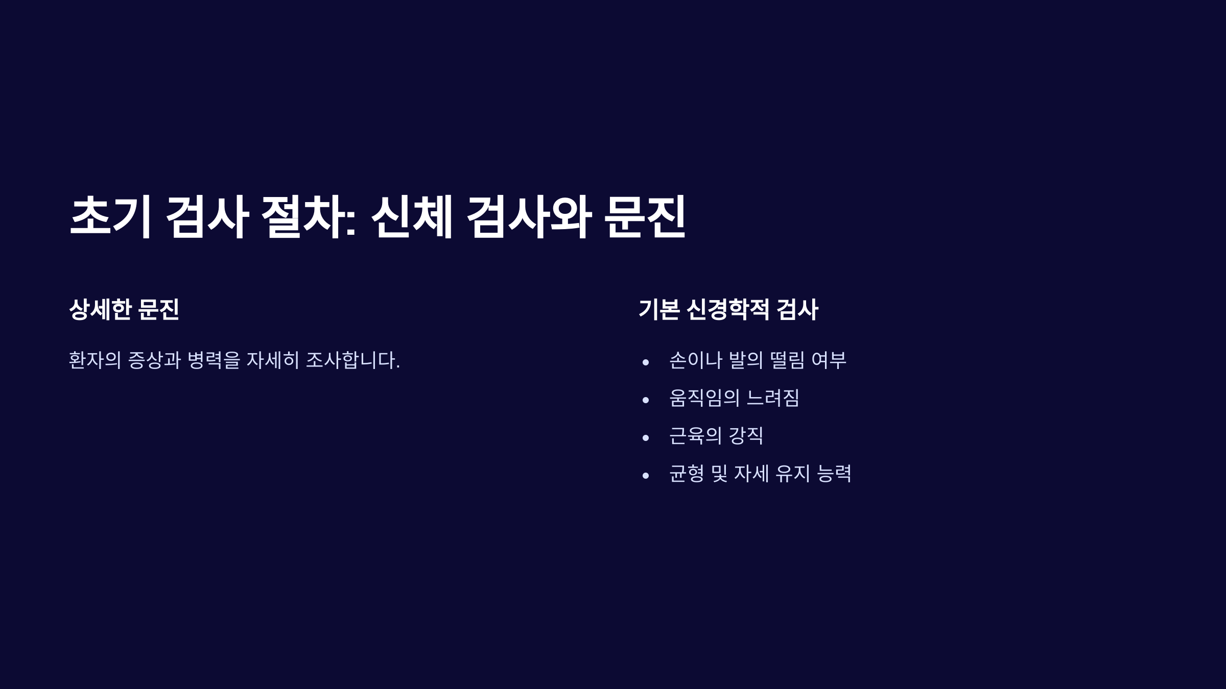 첫 번째 단계는 상세한 문진과 기본 신경학적 검사입니다. 특히 다음 항목을 주의 깊게 평가합니다.