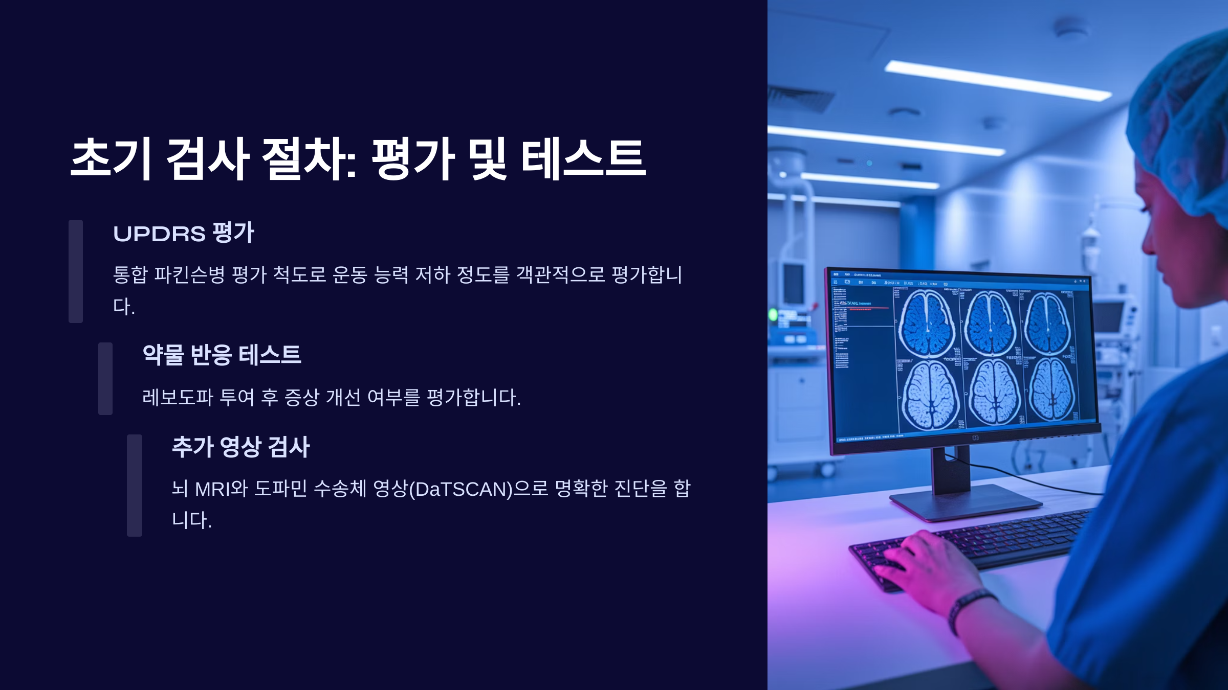 비슷한 증상을 보이는 질환(예: 다계통 위축증, 진행성 핵상 마비, 혈관성 파킨슨증 등)과 구별하는 과정이 매우 중요합니다. 이를 위해 MRI, 혈액 검사, 특정 약물 반응 테스트를 병행하기도 합니다.