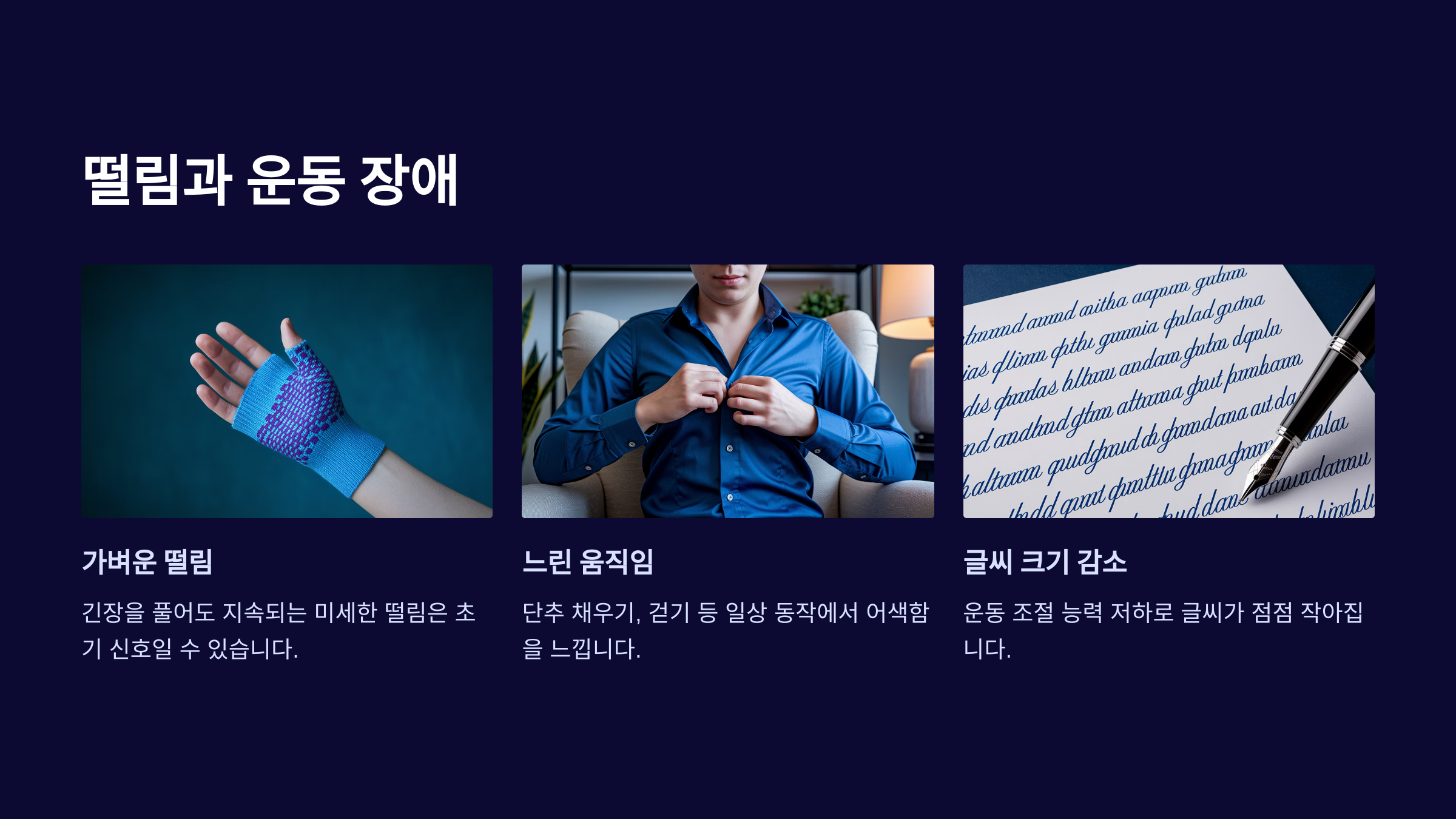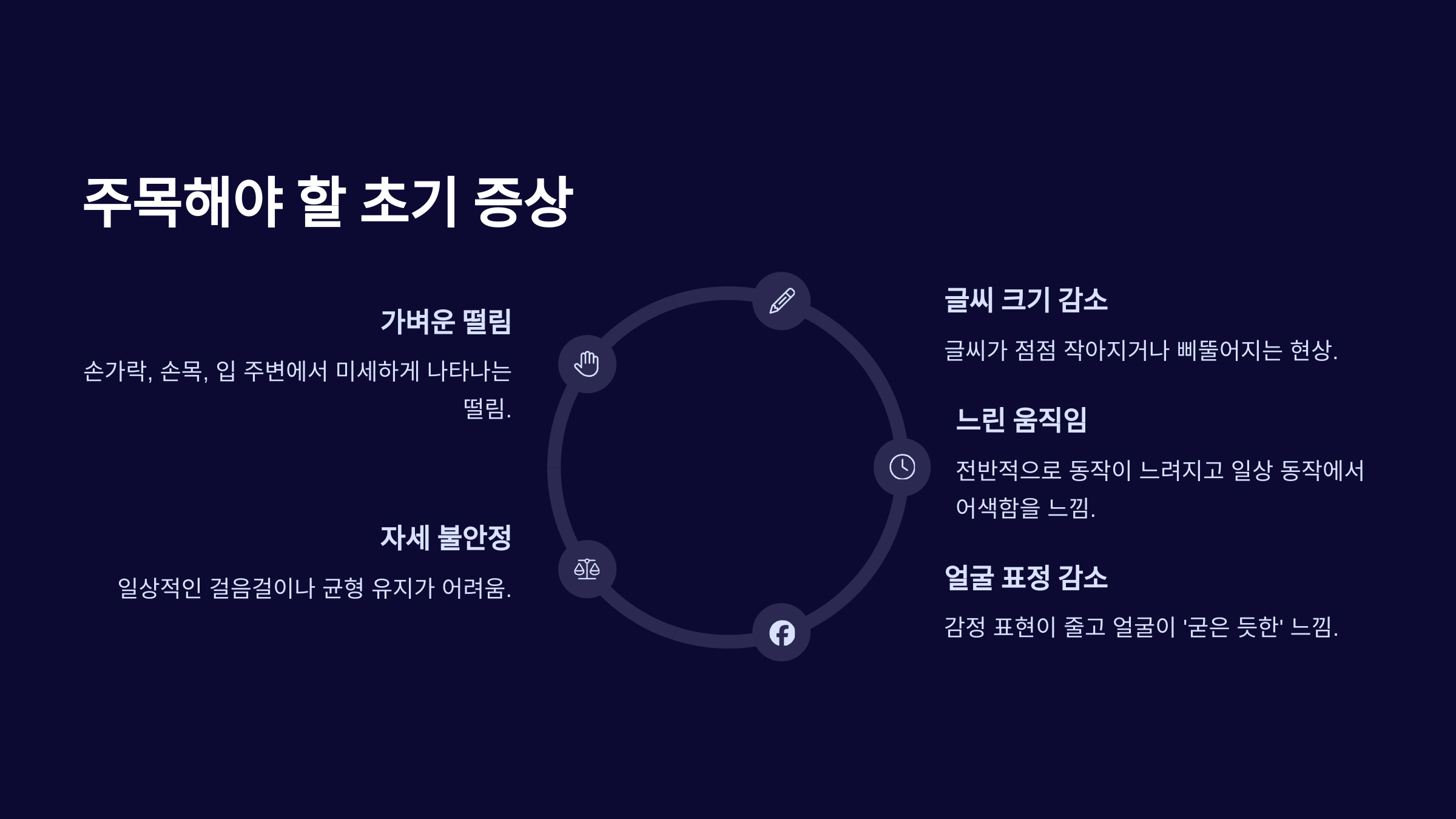 단순히 '피곤해서'가 아니라 전반적으로 동작이 느려지고, 일상 속 동작(예: 단추 채우기, 걷기)에서 어색함을 느낀다면 의심해봐야 합니다.