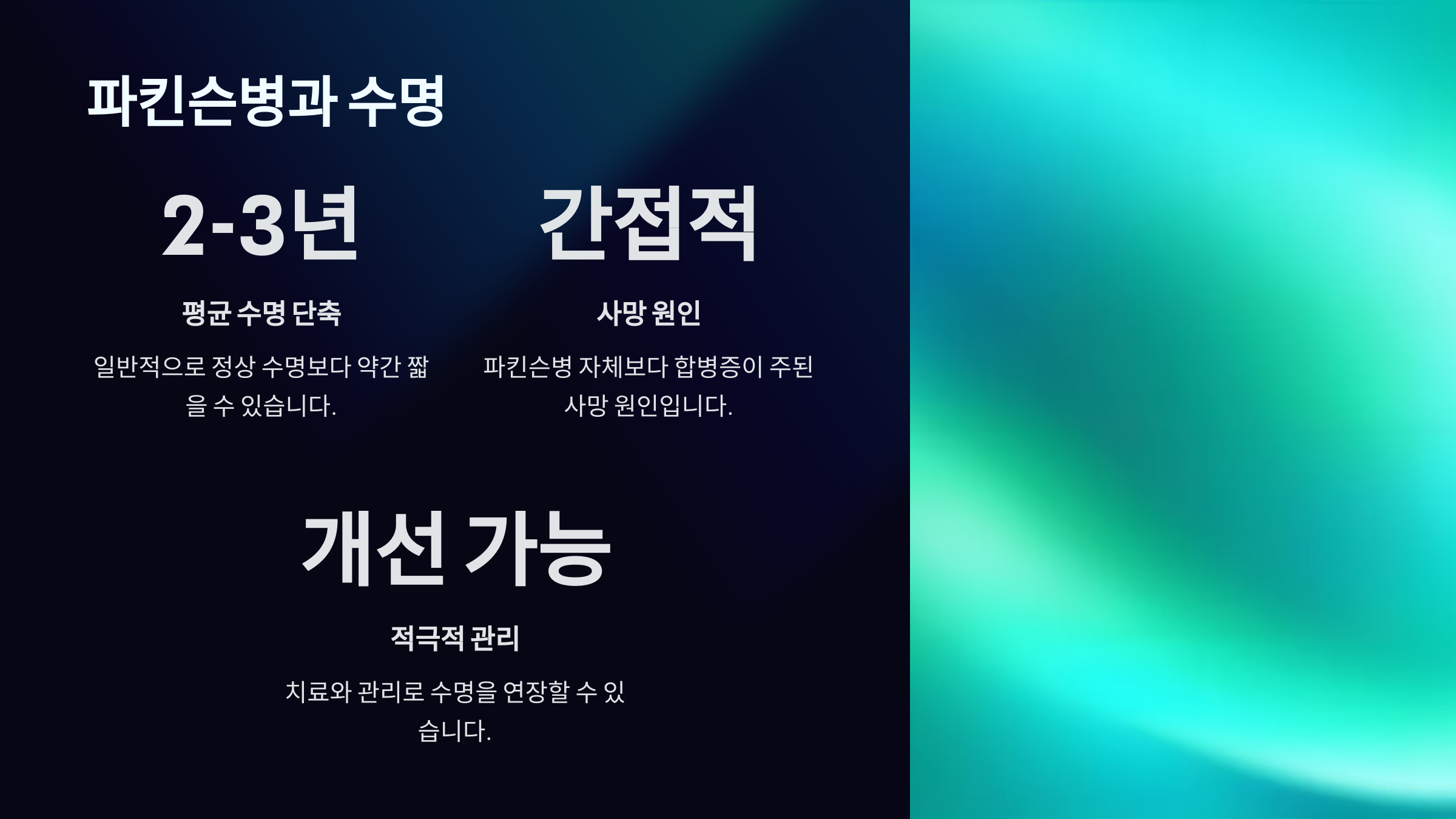 파킨슨병 환자의 수명은 평균적으로 정상적인 수명에 비해 약간 짧을 수 있습니다. 연구에 따르면, 파킨슨병을 앓고 있는 환자들의 평균 수명은 약 2-3년 정도 단축될 수 있으며, 이는 병의 진행 속도와 치료 방법에 따라 다를 수 있습니다. 그러나, 파킨슨병은 직접적인 사망 원인이 되지 않으며, 환자들이 사망하는 주된 이유는 폐렴이나 심장 질환, 기타 합병증 때문입니다. 환자가 적극적인 치료를 받고, 신체 기능을 유지하려는 노력을 한다면, 수명은 상당히 길어질 수 있습니다.