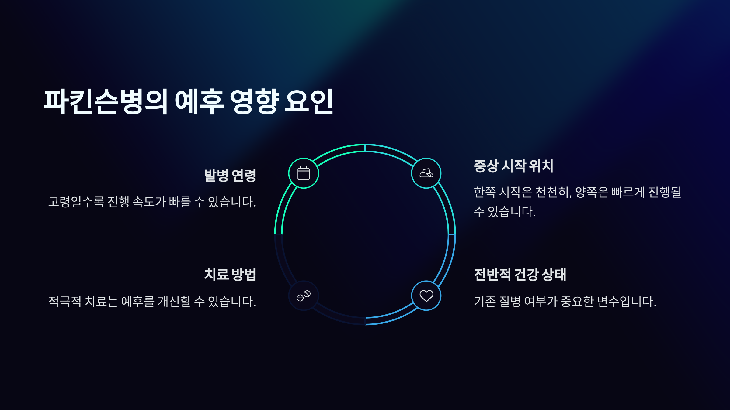 파킨슨병의 예후는 환자마다 다르며, 다양한 요인에 의해 영향을 받습니다. 첫째, 발병 연령이 중요한 예후 지표입니다. 일반적으로 파킨슨병은 60대 이후에 발병하는 경우가 많으며, 나이가 많을수록 병의 진행 속도가 빠를 수 있습니다. 둘째, 증상의 시작이 한쪽에서만 나타나는 경우와 양쪽에서 동시에 나타나는 경우에 따라 예후가 달라집니다. 증상이 한쪽에서 시작되면 상대적으로 병이 천천히 진행될 수 있는 반면, 양쪽에서 동시에 증상이 나타나면 더 빠르게 진행될 가능성이 높습니다. 셋째, 환자의 전반적인 건강 상태와 기존의 질병 여부도 중요한 변수로 작용합니다.