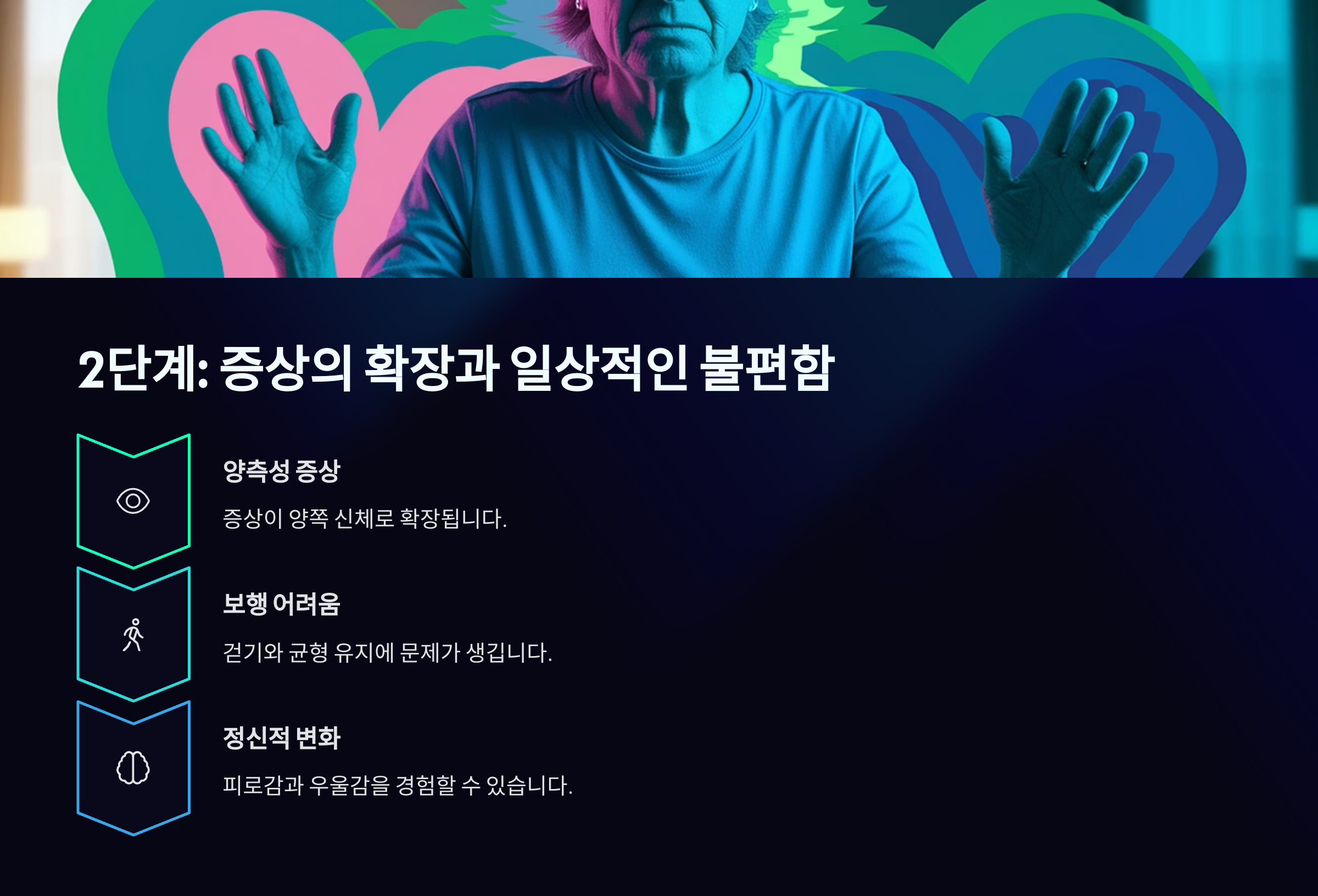 두 번째 단계에서는 증상이 양쪽 신체로 확장됩니다. 이는 운동 능력에 더 큰 영향을 미치고, 일상 활동을 수행하는 데 점차적으로 어려움을 겪게 됩니다. 예를 들어, 걷기나 균형을 유지하는 데 문제가 생기고, 손이나 팔의 떨림이 두드러지게 나타날 수 있습니다. 이 시기의 환자는 혼자서 일상적인 일을 처리하는 데 어려움을 느끼며, 직장이나 가정에서 더 많은 도움이 필요할 수 있습니다. 또한, 환자는 피로감과 우울감을 경험할 수 있으며, 이는 운동 능력뿐만 아니라 정신적인 상태에도 영향을 미칩니다.