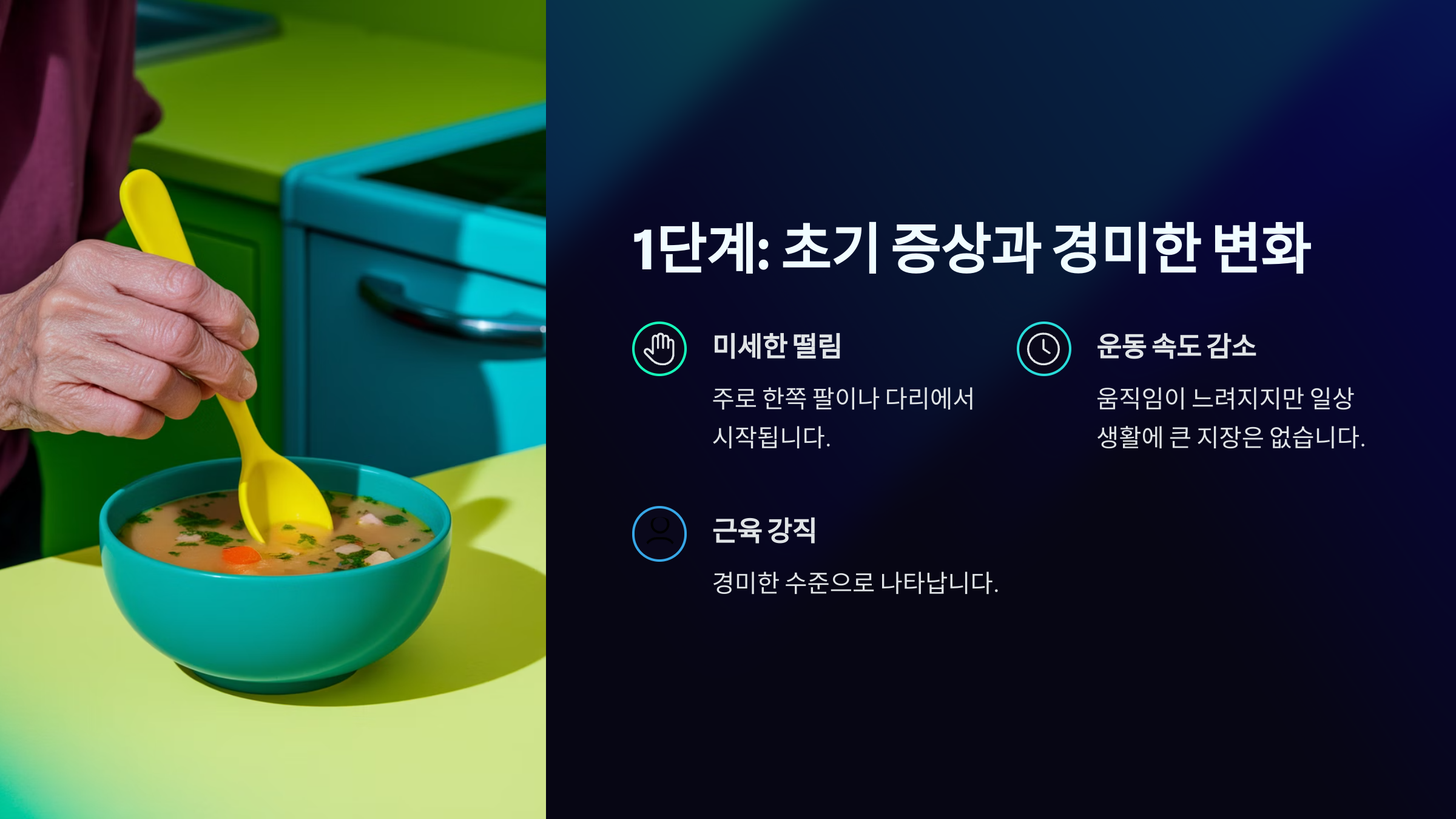파킨슨병의 초기 단계에서는 증상이 경미하고, 일반적인 일상 활동에는 큰 지장을 주지 않습니다. 이 단계에서 환자는 미세한 떨림, 운동 속도의 감소, 근육 강직 등의 증상을 겪을 수 있지만, 이 모든 증상이 일상생활에 큰 영향을 미치지 않는 경우가 많습니다. 초기 단계에서는 주로 한쪽 팔이나 다리에서 증상이 시작되며, 점차적으로 다른 쪽으로 퍼질 수 있습니다. 이 시기의 환자는 주변 사람들에게 증상이 잘 드러나지 않으며, 직장이나 가정에서 여전히 정상적인 역할을 할 수 있습니다.