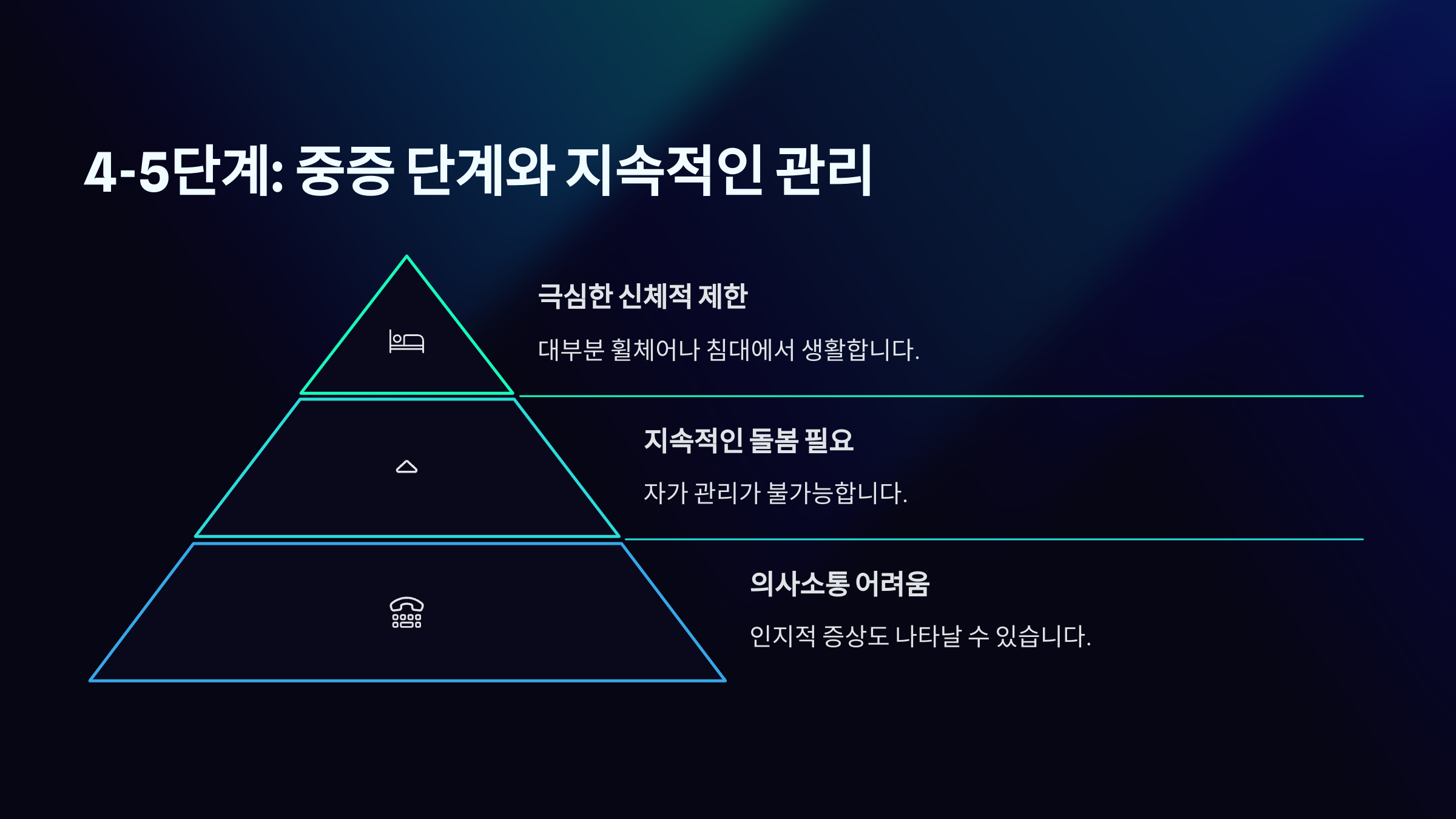 최종 단계에서는 환자의 신체 능력이 극도로 제한됩니다. 대부분의 환자는 휠체어를 사용하거나 침대에서 생활하며, 자가 식사나 배변, 배뇨 등을 할 수 없습니다. 이 시기에는 환자의 생명 유지와 관리에 집중해야 하며, 가족이나 의료진의 지속적인 돌봄이 필요합니다. 또한, 환자는 점차적으로 의사소통이 어려워지고, 일부 환자는 기억력 저하나 혼란 등의 인지적 증상도 나타날 수 있습니다. 최종 단계에서는 환자의 삶의 질을 최대한 유지하기 위한 호스피스나 완화 치료가 필요한 경우도 많습니다.