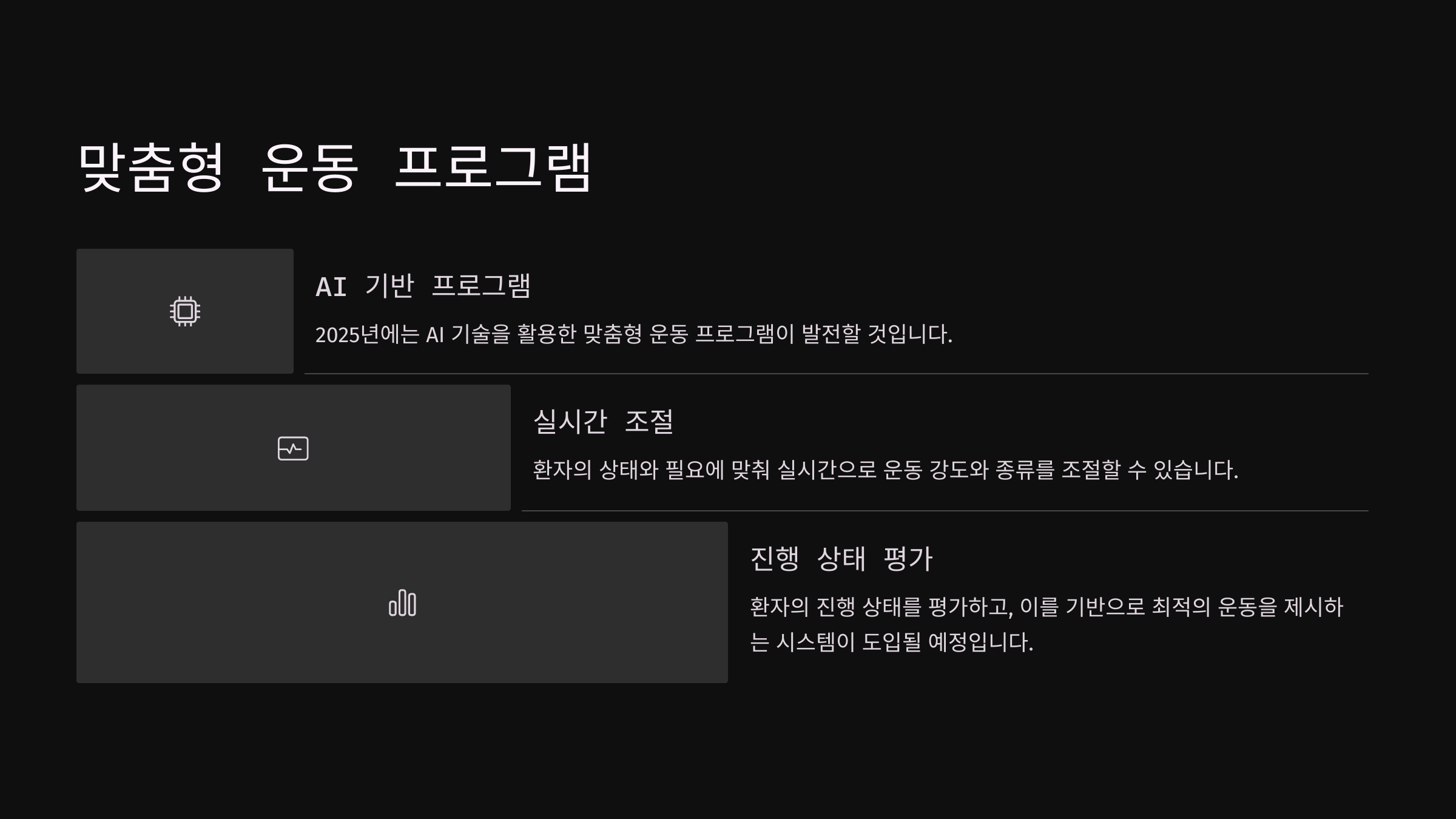 2025년에는 파킨슨병 환자에게 맞춤형 운동 프로그램이 더욱 발전할 것입니다. 최신 기술을 활용해, 환자의 상태와 필요에 맞춰 실시간으로 운동 강도와 종류를 조절할 수 있습니다. 이와 같은 기술적 발전은 환자가 더욱 지속적이고 효과적인 운동 치료를 받을 수 있게 도와줄 것입니다. 또한, 환자의 진행 상태를 평가하고, 이를 기반으로 최적의 운동을 제시하는 시스템도 도입될 예정입니다.