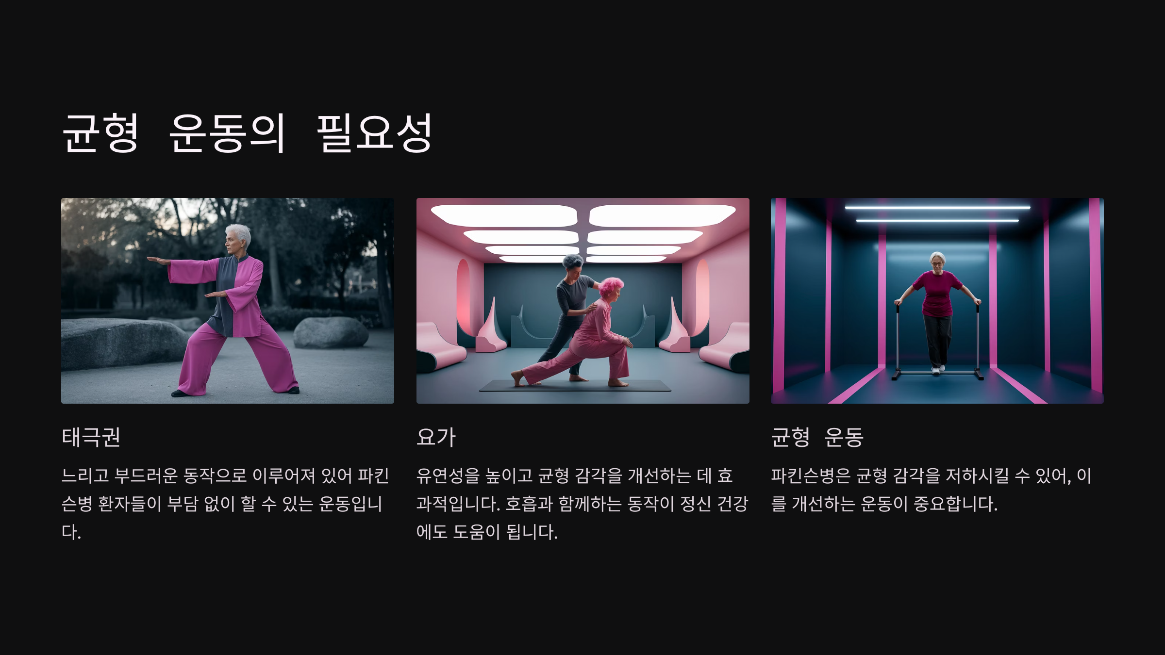 균형 운동은 파킨슨병 환자에게 꼭 필요한 운동입니다. 파킨슨병은 균형 감각을 저하시킬 수 있기 때문에, 이를 개선하는 운동이 중요합니다. 태극권, 요가, 스트레칭 등의 운동은 환자들이 균형을 잡는 데 도움을 줍니다. 특히 태극권은 느리고 부드러운 동작으로 이루어져 있어 파킨슨병 환자들이 부담 없이 할 수 있는 운동입니다. 2025년에는 AI 기반 프로그램이 제공하는 맞춤형 균형 운동이 환자들에게 더 효과적인 결과를 가져올 수 있을 것입니다.