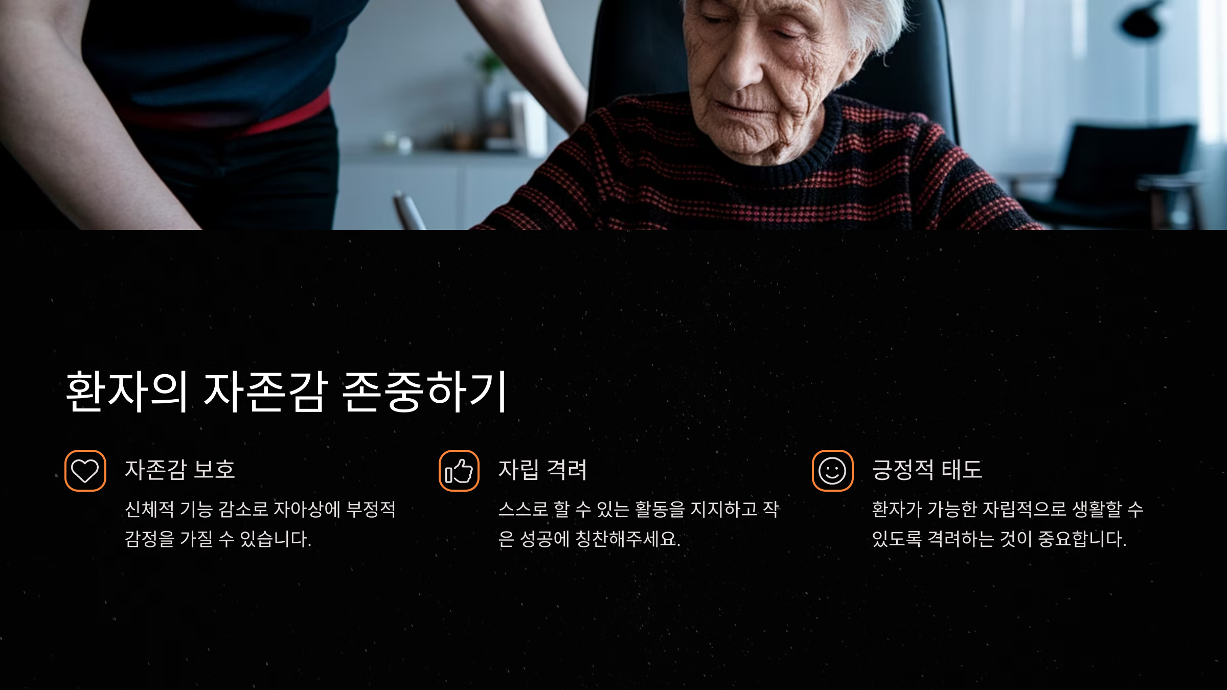 파킨슨병 환자는 점차적으로 신체적 기능이 감소하면서 자존감에 큰 영향을 받을 수 있습니다. 운동 능력의 저하, 떨림, 불안정한 균형 등의 증상으로 인해 환자는 종종 자아상에 대한 부정적인 감정을 가질 수 있습니다. 따라서 간병인은 환자의 자존감을 존중하고, 그들이 가능한 한 자립적으로 생활할 수 있도록 격려해야 합니다. 예를 들어, 일상적인 활동에서 작은 성공을 이룰 때마다 칭찬하고 격려하며, 환자가 스스로 할 수 있는 활동을 지지하는 것이 중요합니다.