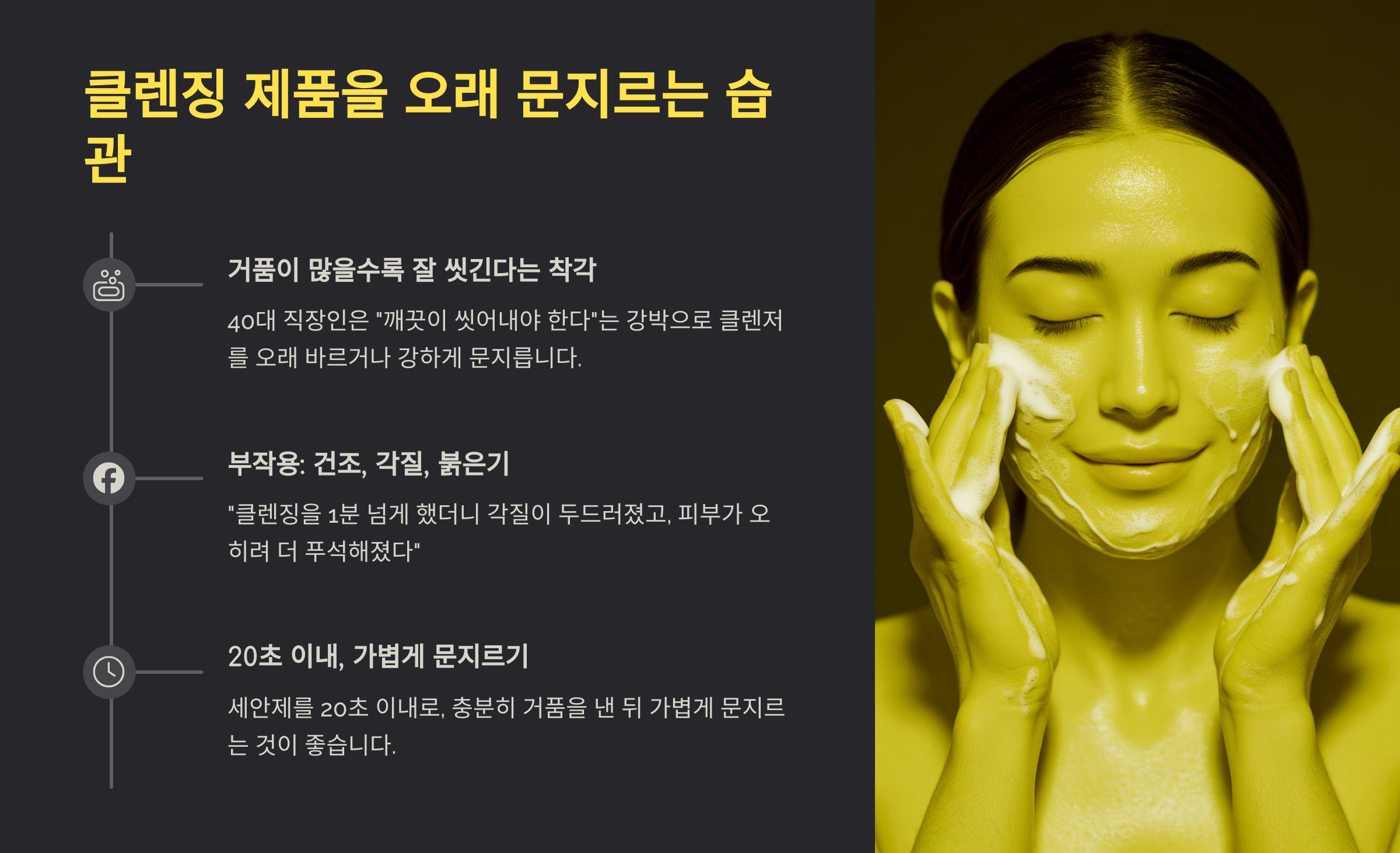 40대 직장인 중 다수는 하루 종일 메이크업이나 외부 먼지에 노출되기 때문에 "깨끗이 씻어내야 한다"는 강박을 갖기 쉽습니다. 이로 인해 클렌저를 오래 바르거나, 강하게 문지르며 자극을 주는 경우가 많습니다.