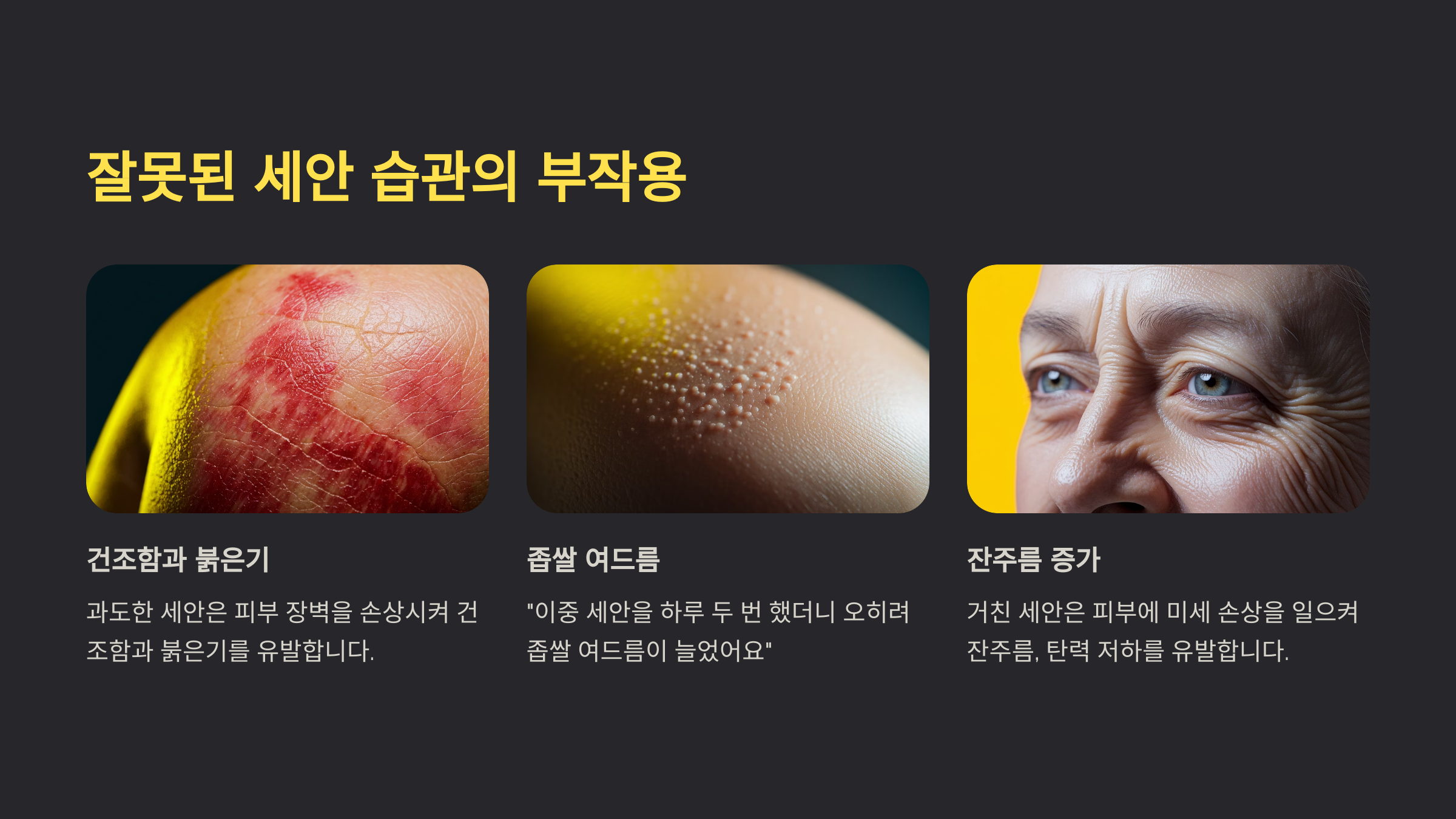 “이중 세안을 하루 두 번 했더니 오히려 좁쌀 여드름이 늘었어요”라는 리뷰가 있었습니다. 또한 “이전에는 트러블 없었는데 갑자기 건조해지고 따갑더라”는 불만도 자주 보였습니다.
