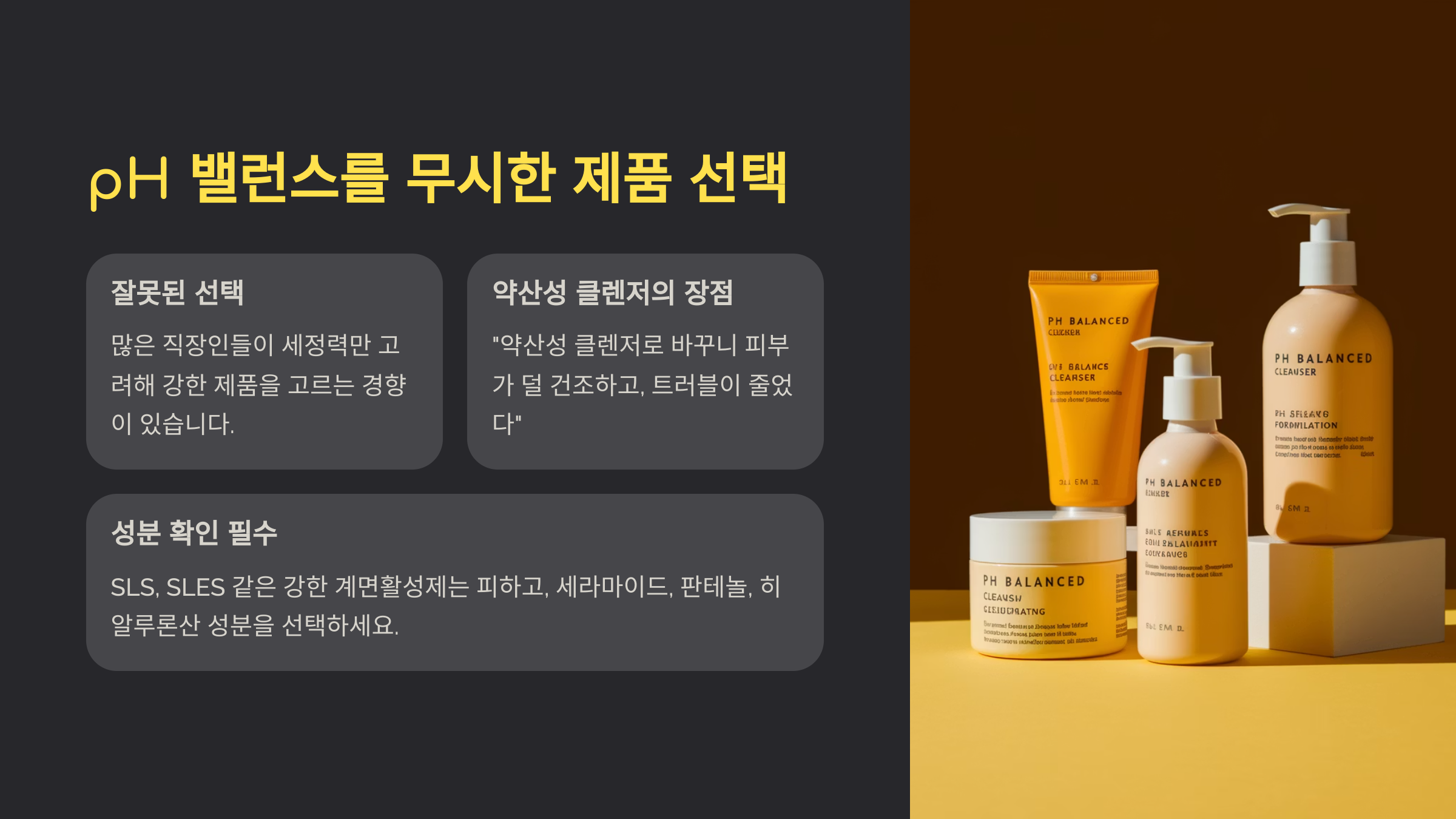 40대 이후 피부는 유수분 밸런스가 깨지기 쉬운 상태입니다. 하지만 많은 직장인들이 세정력만 고려해 강한 제품을 고르는 경향이 있으며, 이는 장기적으로 피부 장벽을 손상시킵니다.