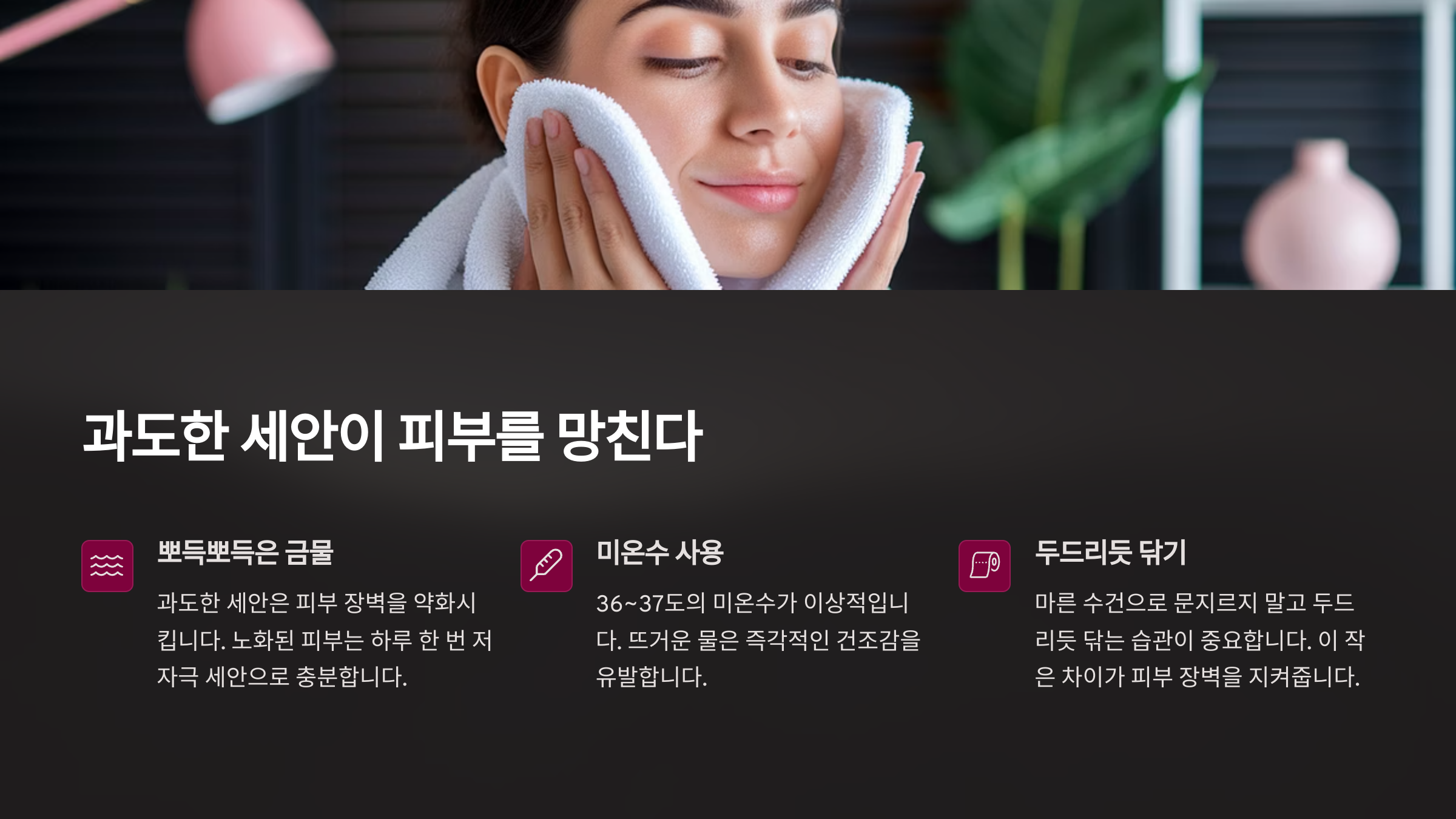 뜨거운 물로 세안하면 즉각적인 건조감을 느끼게 됩니다. **36~37도 정도의 미온수**가 가장 이상적이며, 마른 수건으로 문지르지 않고 **두드리듯 닦는 습관**이 중요합니다. 이 작은 차이가 피부 장벽을 지켜주는 핵심입니다.