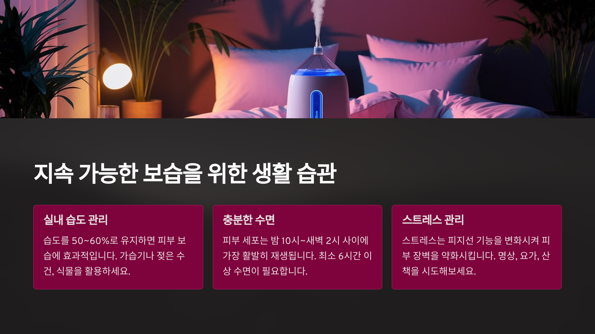 피부 보습은 단순히 크림 하나로 끝나는 문제가 아닙니다. 세안, 수면, 식습관, 스트레스까지 모두 연관된 총체적 습관 관리가 필요합니다.