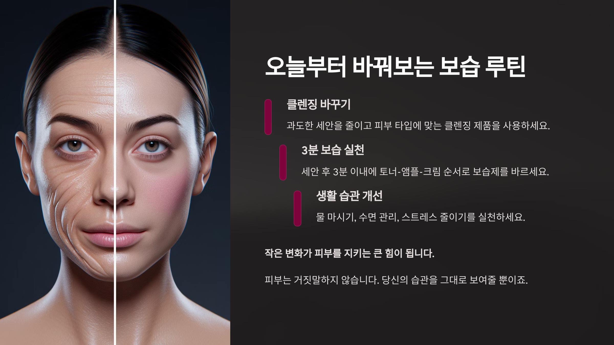 무엇보다 중요한 것은 “지금 당장 할 수 있는 한 가지를 시작해 보는 것”입니다. 오늘은 클렌징을 바꿔보고, 내일은 3분 보습을 실천해 보세요. **작은 변화가 피부를 지키는 큰 힘이 됩니다.**