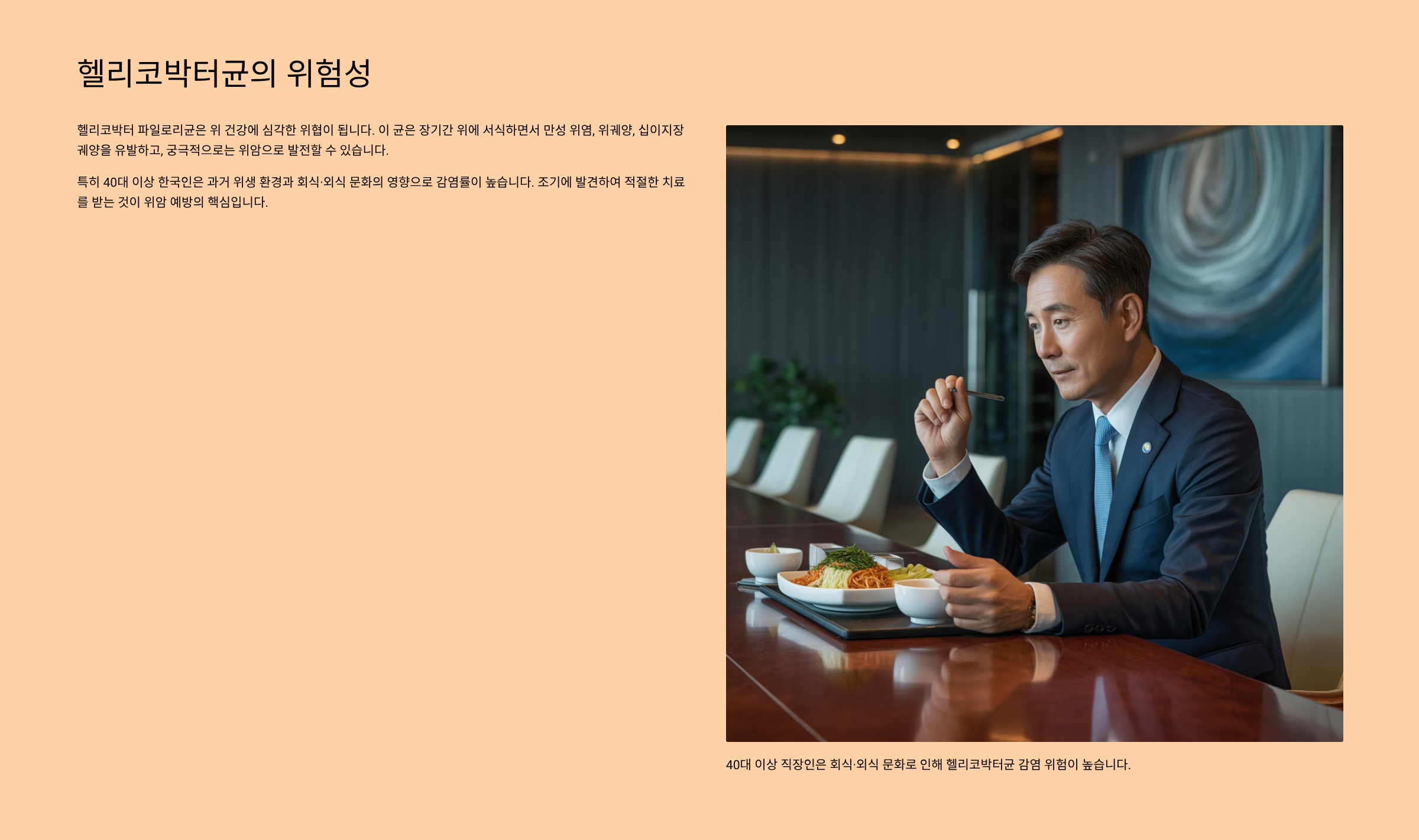 헬리코박터 파일로리균은 ‘위 속의 잠복 암 씨앗’이라 불릴 만큼 장기적인 위 건강에 치명적입니다. 특히 40대 이상인은 과거 위생 환경과 회식·외식 문화 영향으로 감염 가능성이 높습니다. 조기 진단과 적절한 제균 치료를 받으면 위암 발병 위험을 크게 줄일 수 있습니다.