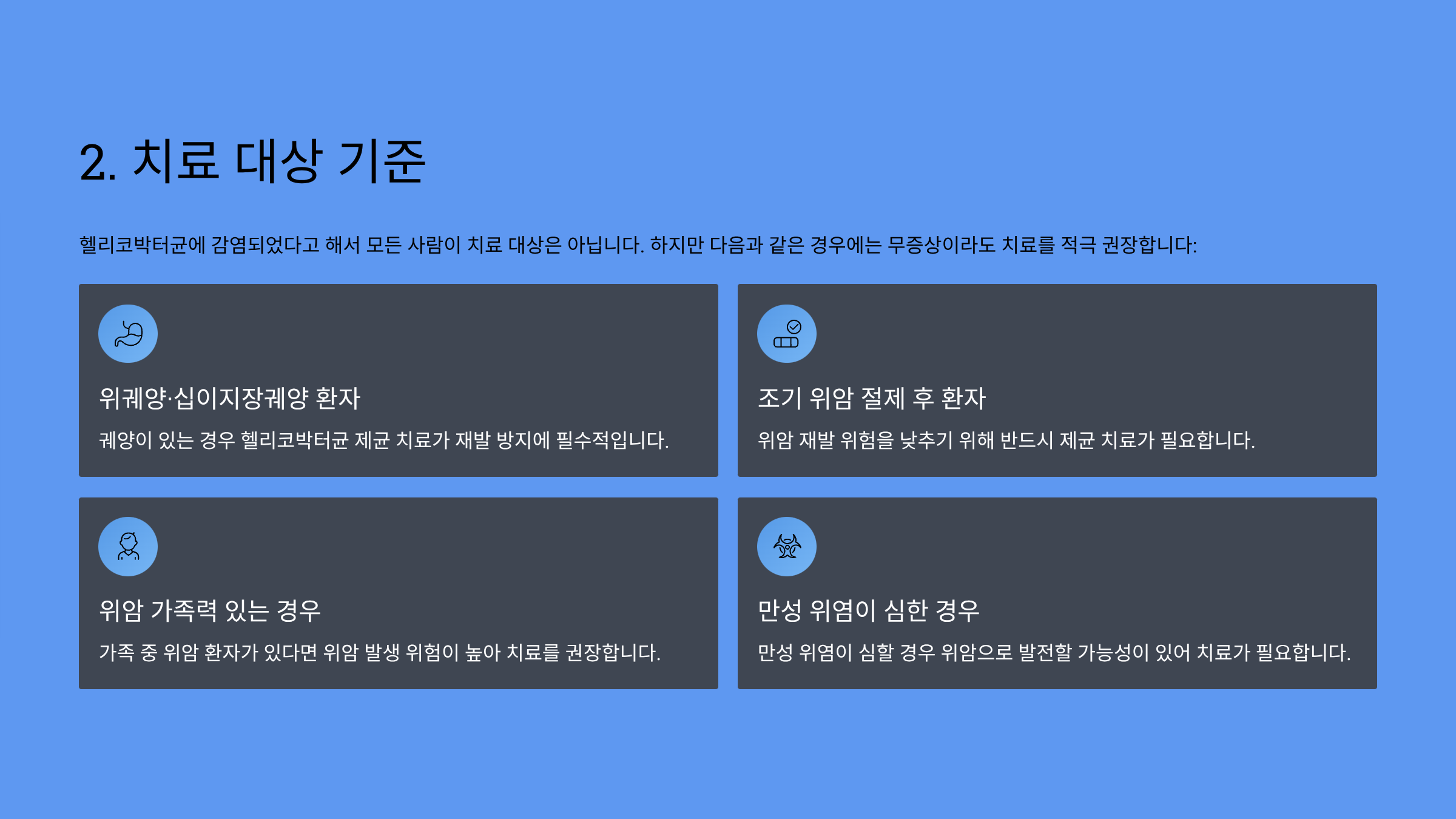 - 위궤양, 가족력 등 고위험군은 적극 치료 필요