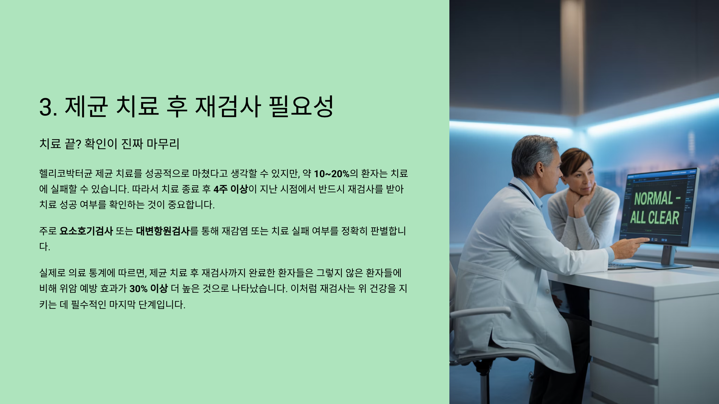 실제 의료 통계에서도 제균 치료 후 재검사까지 받은 환자의 위암 예방 효과가 그렇지 않은 환자보다 30% 이상 높았습니다.