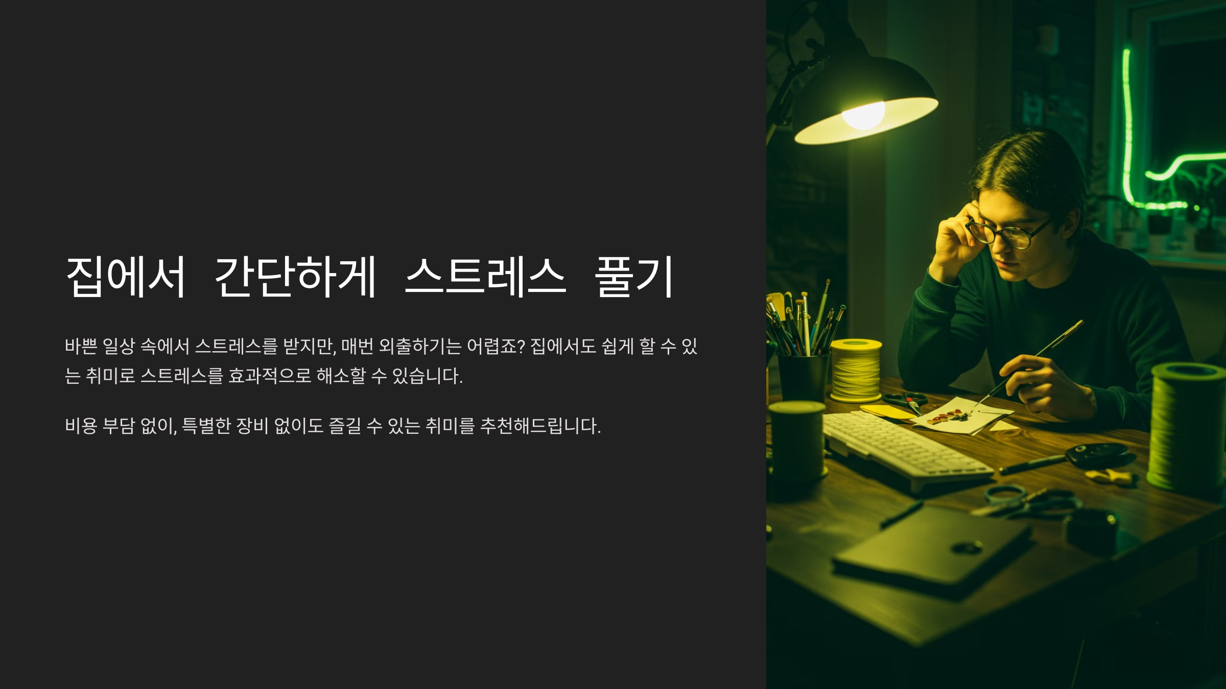 | 집에서 할 수 있는 간단한 취미 추천, 스트레스 해소 효과 100% (0) | 2025.03.26 |