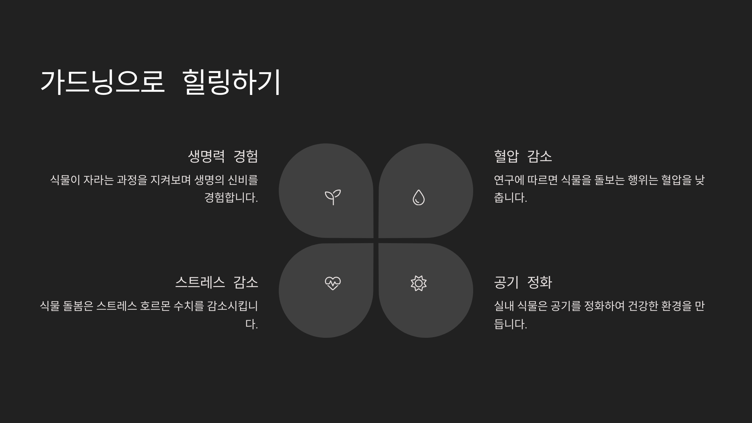 식물을 키우는 것은 심리적 안정감을 줍니다. 연구에 따르면 10분만 정원을 가꾸어도 혈압이 낮아지고 마음이 차분해진다고 합니다. 오늘부터 작은 화분 하나라도 키워보는 건 어떨까요?