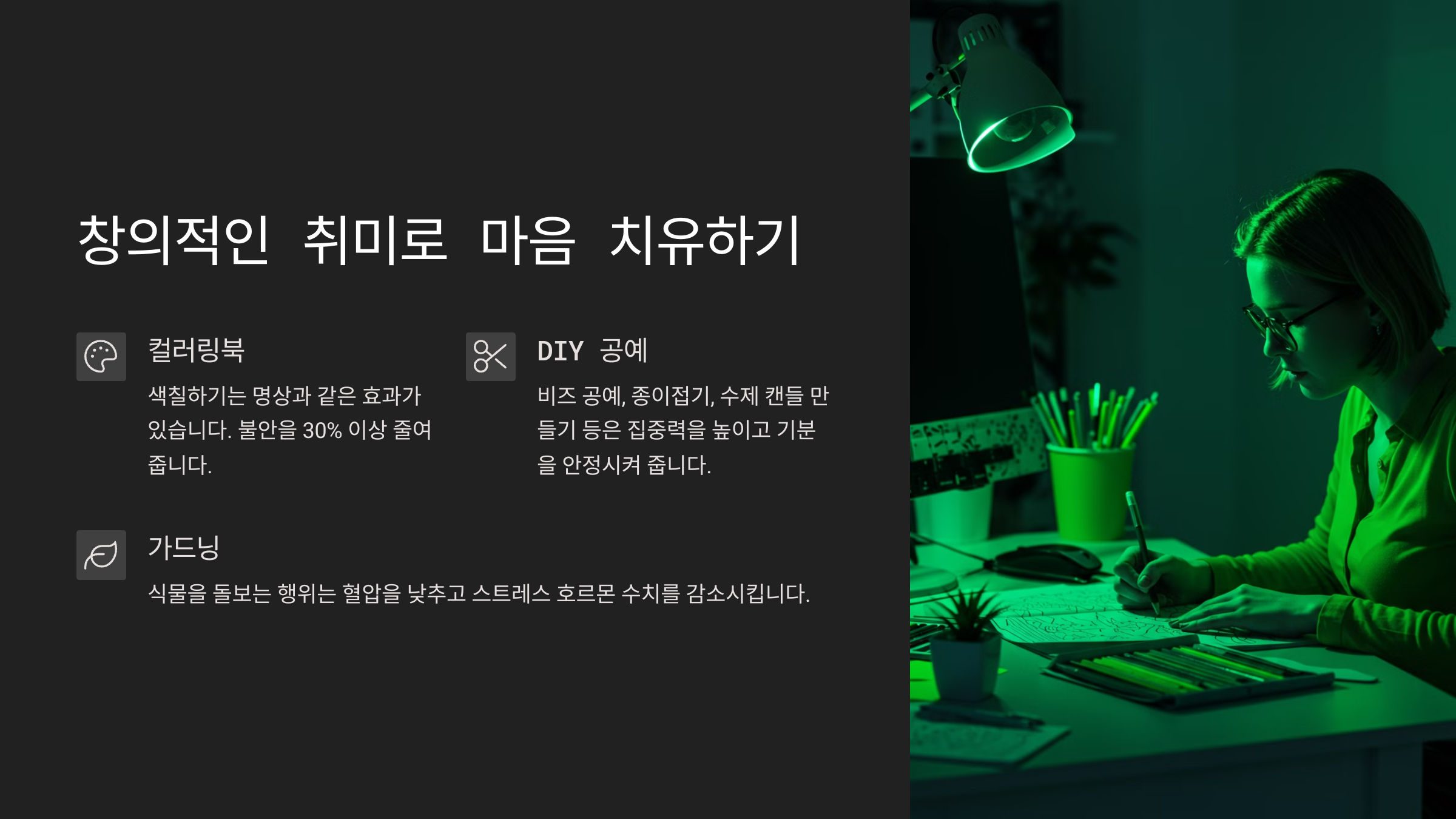 우리 모두 바쁜 일상 속에서 스트레스를 느끼죠. 하지만 제대로 해소하지 않으면 건강에도 악영향을 미칠 수 있습니다. 오늘은 혼자서도 쉽게 할 수 있는 힐링 취미 7가지를 소개해드릴게요. 전문가들도 추천하는 방법이니 끝까지 읽어보세요!