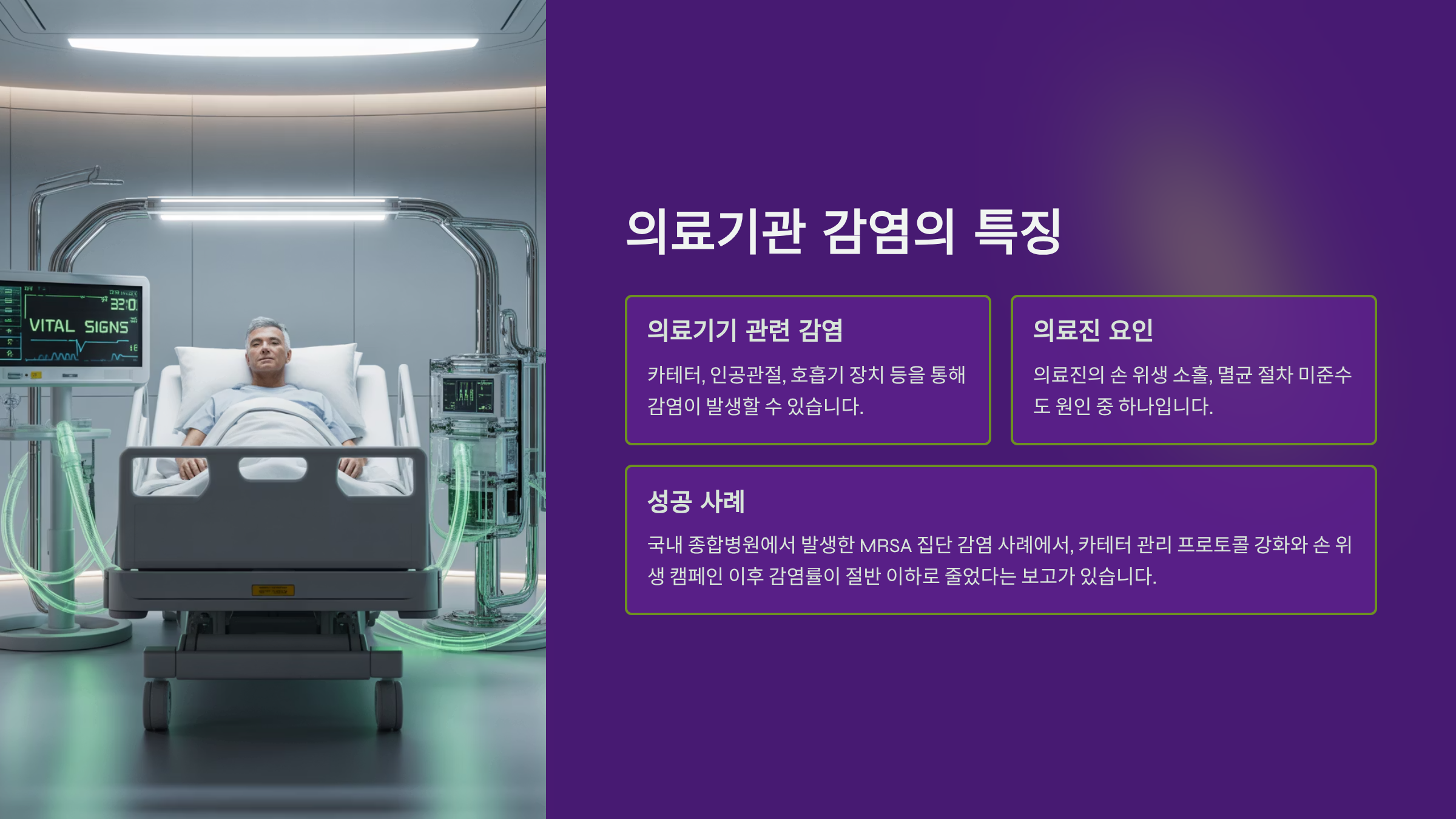 병원 내에서는 카테터, 인공관절, 호흡기 장치 등을 통해 감염이 발생할 수 있습니다. 의료진의 손 위생 소홀, 멸균 절차 미준수도 원인 중 하나입니다. 실제로 국내 종합병원에서 발생한 MRSA 집단 감염 사례에서, 카테터 관리 프로토콜 강화와 손 위생 캠페인 이후 감염률이 절반 이하로 줄었다는 보고가 있습니다.