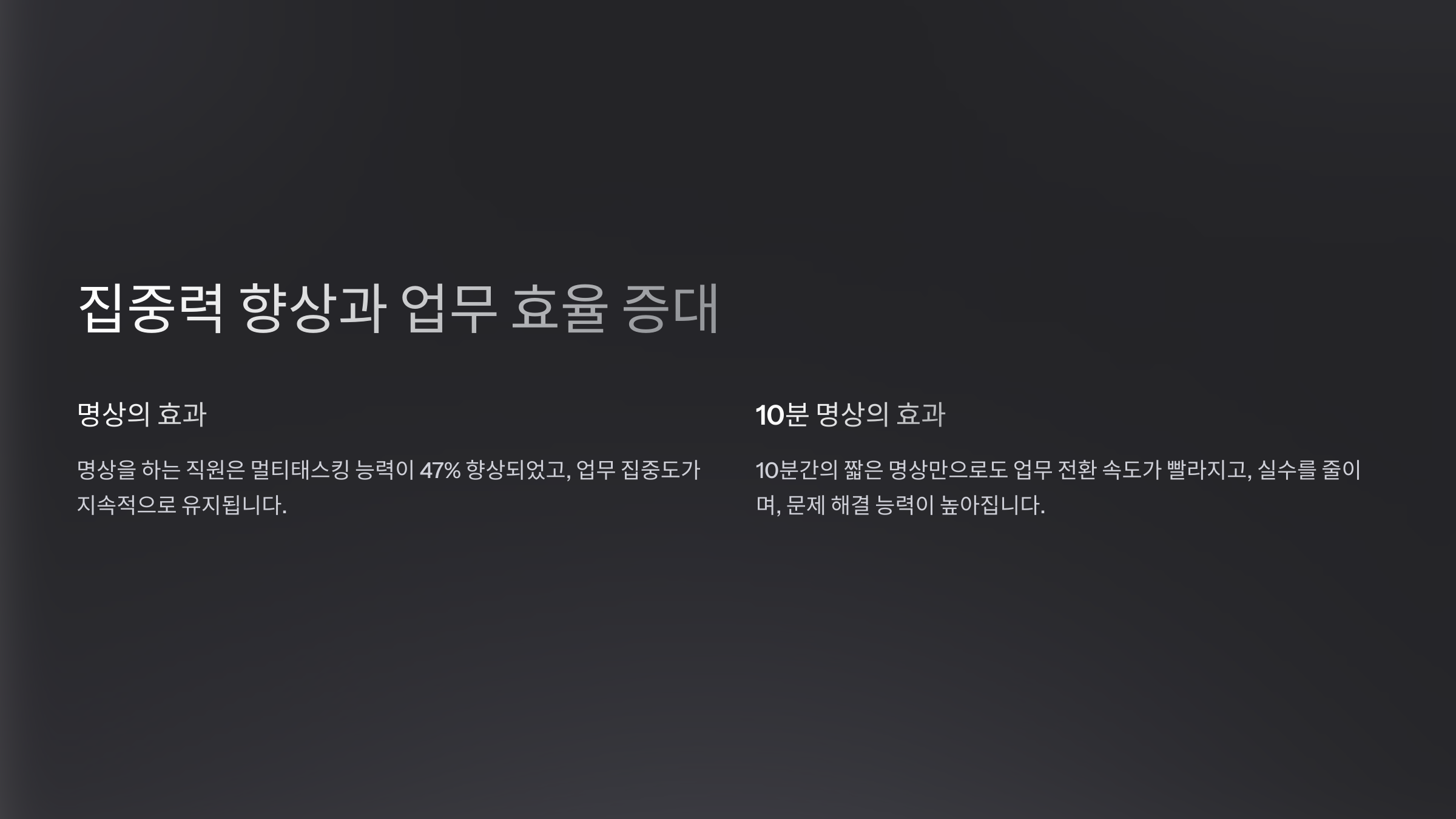 🟢 10분간의 짧은 명상만으로도 업무 전환 속도가 빨라지고, 실수를 줄이며, 문제 해결 능력이 높아집니다.