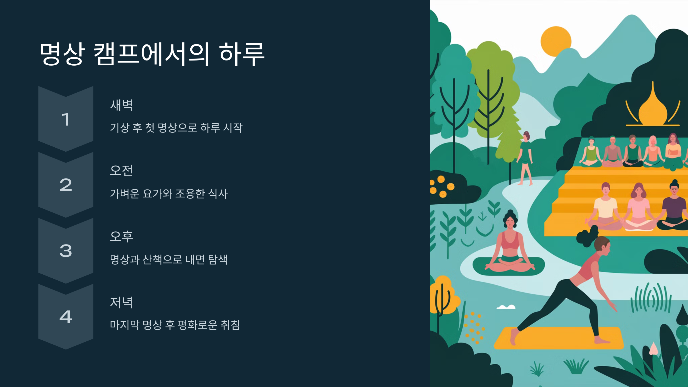 보통 새벽 기상 → 명상 → 가벼운 요가 → 조용한 식사 → 명상 → 산책 → 저녁 명상 → 취침 이런 일정으로 진행돼요.