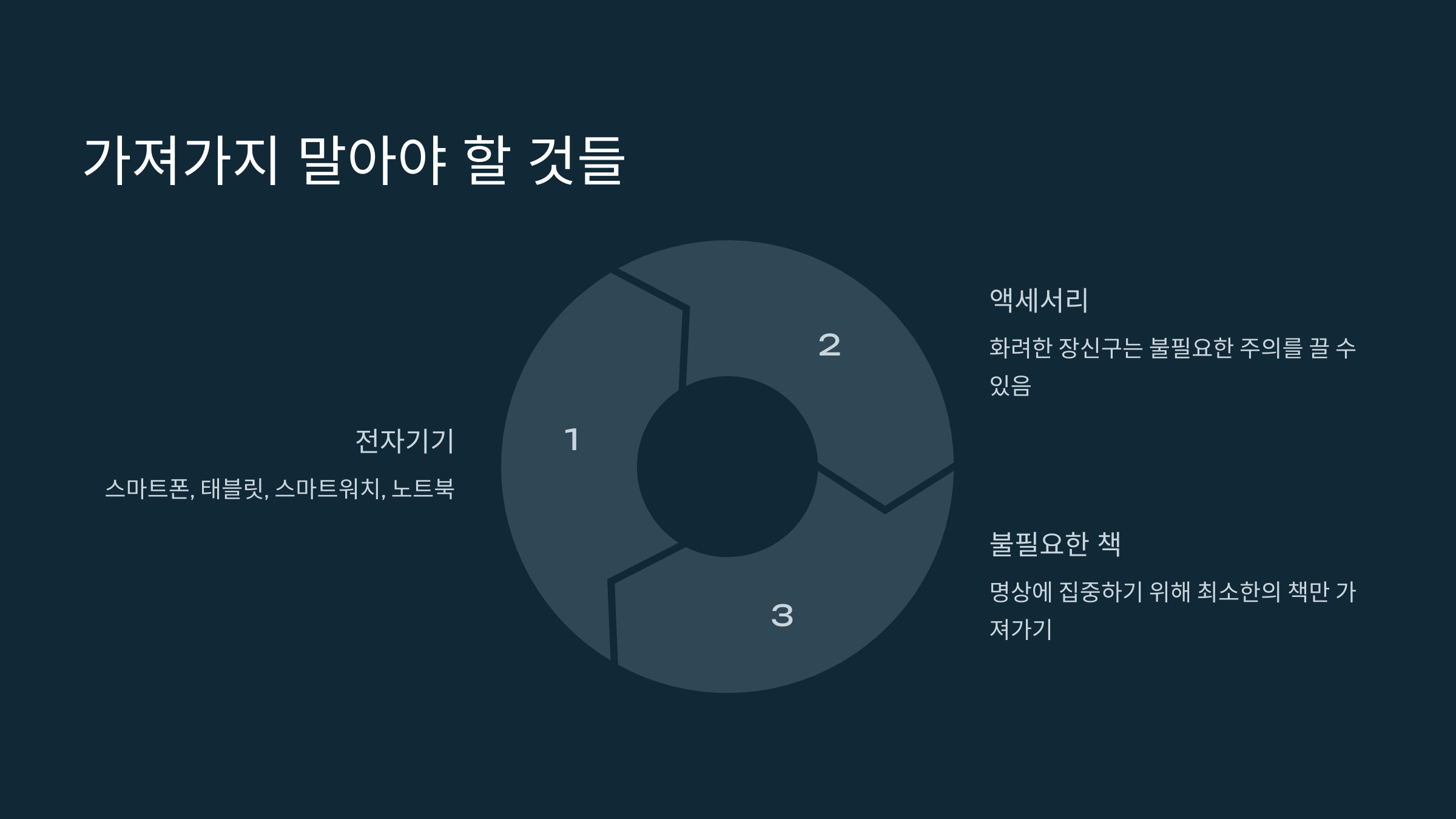 명상 캠프는 일반적인 여행과는 다르게 불필요한 짐을 줄이고, 꼭 필요한 것만 가져가는 것이 중요해요.
