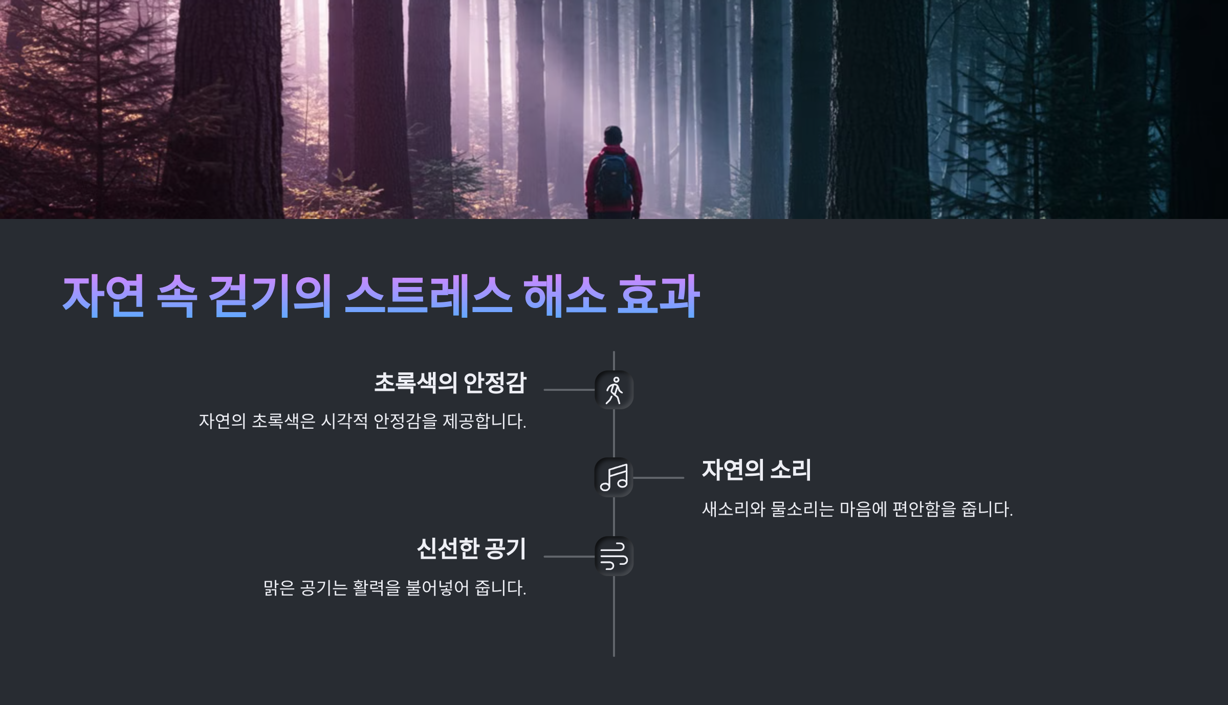 자연 속을 걷는 것은 단순한 운동 이상의 의미를 가집니다. 초록색이 주는 안정감, 자연의 소리(새소리, 물소리)가 주는 편안함, 신선한 공기가 주는 활력은 스트레스 해소에 탁월한 효과를 발휘합니다.
