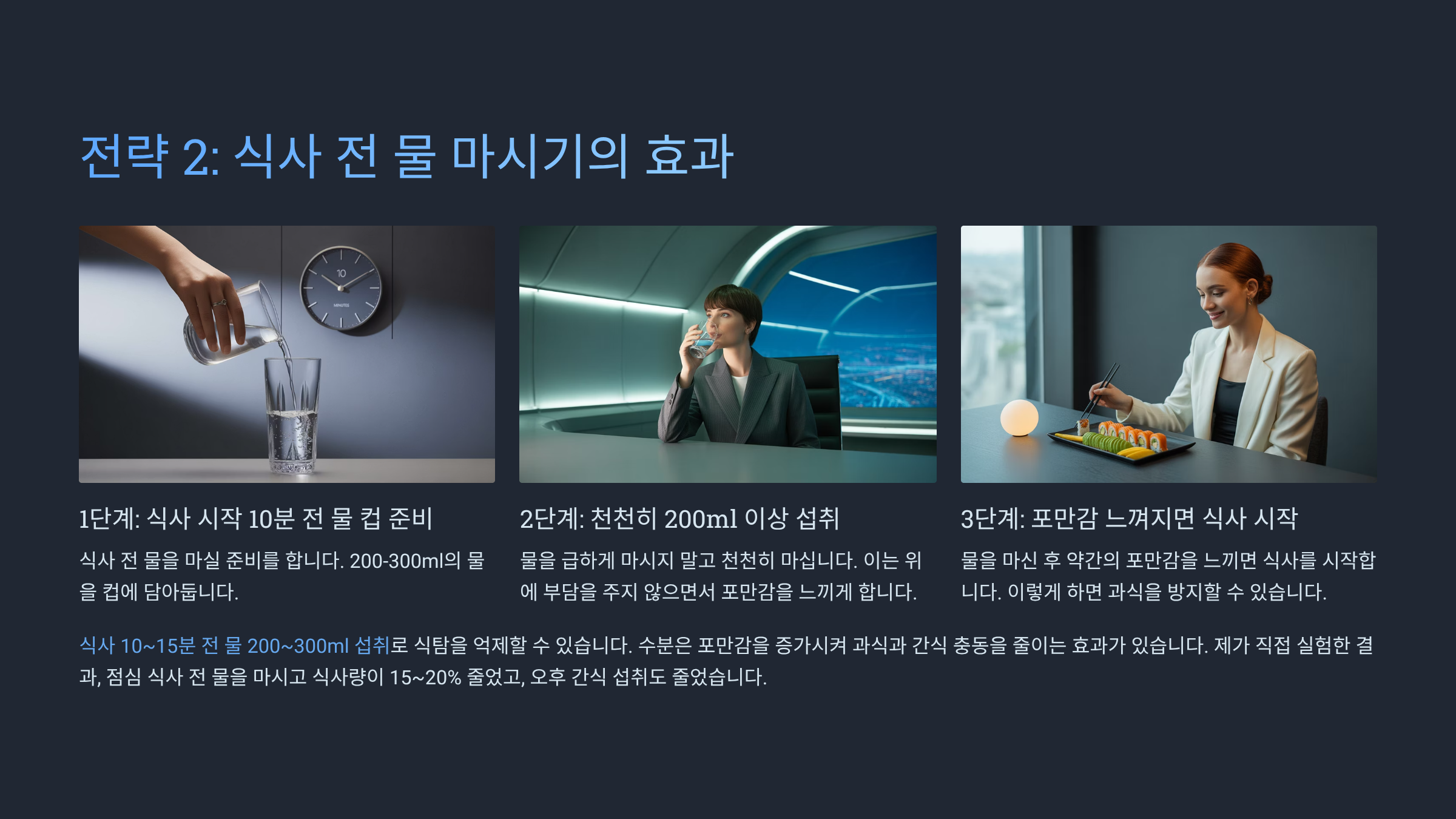 식사 10~15분 전 **물 200~300ml 섭취**로 식탐을 억제할 수 있습니다.