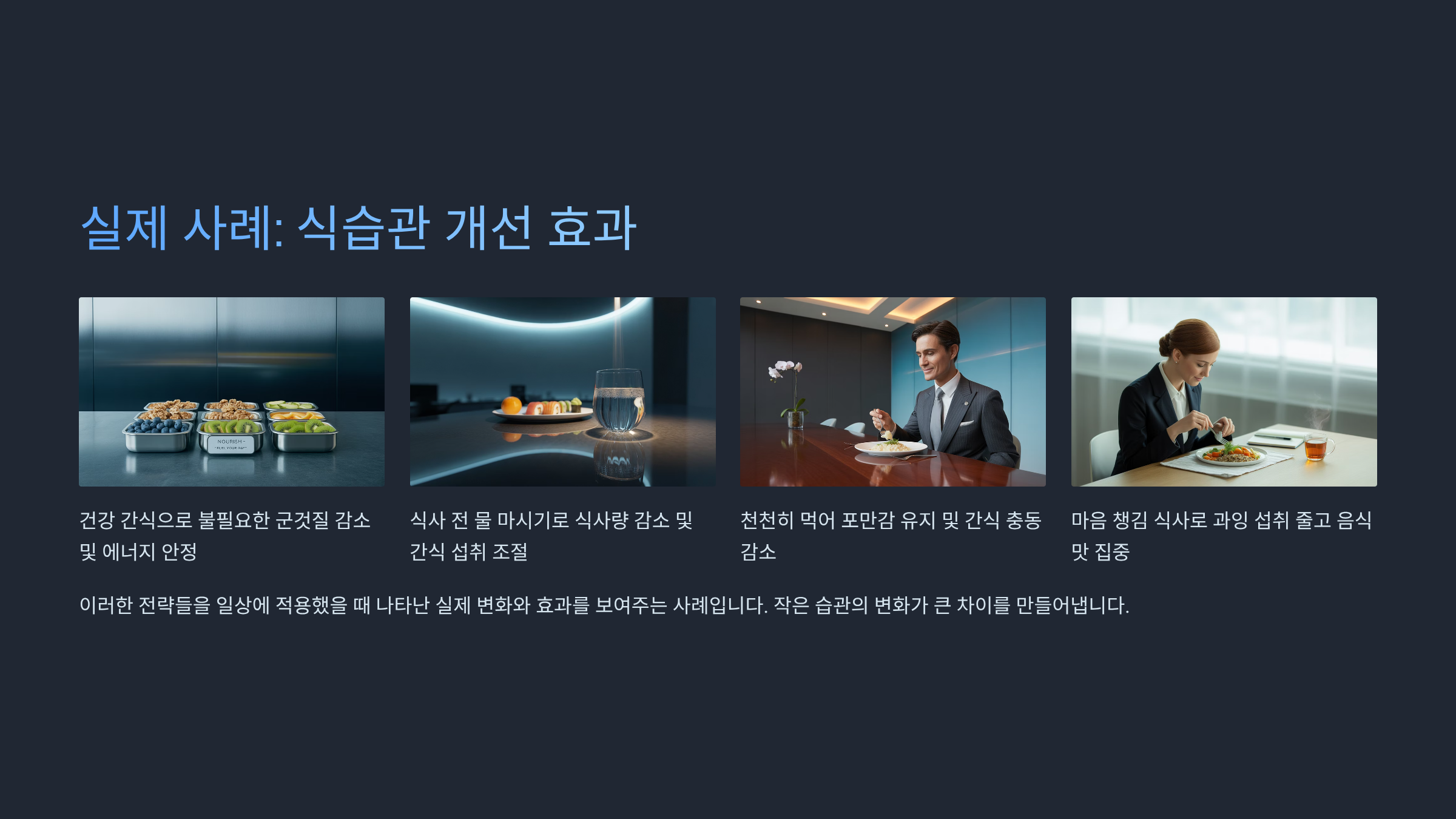사례로, 제가 점심 식사를 15분에서 25분으로 늘리자 식사 후 배부름이 더 오래 유지되고 오후 간식 충동이 줄었습니다.