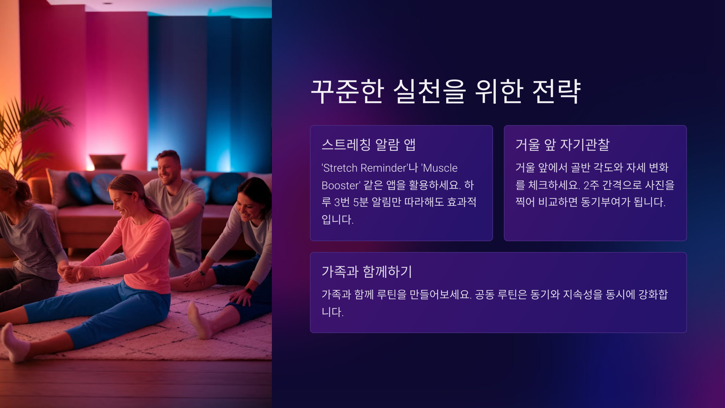 혼자 하기 어렵다면 가족과 함께 루틴을 만들어보세요. “아내와 함께 스트레칭을 시작하면서 둘 다 자세가 좋아졌다”는 중년 직장인의 사례처럼, 가족과의 공동 루틴은 동기와 지속성을 동시에 강화합니다.