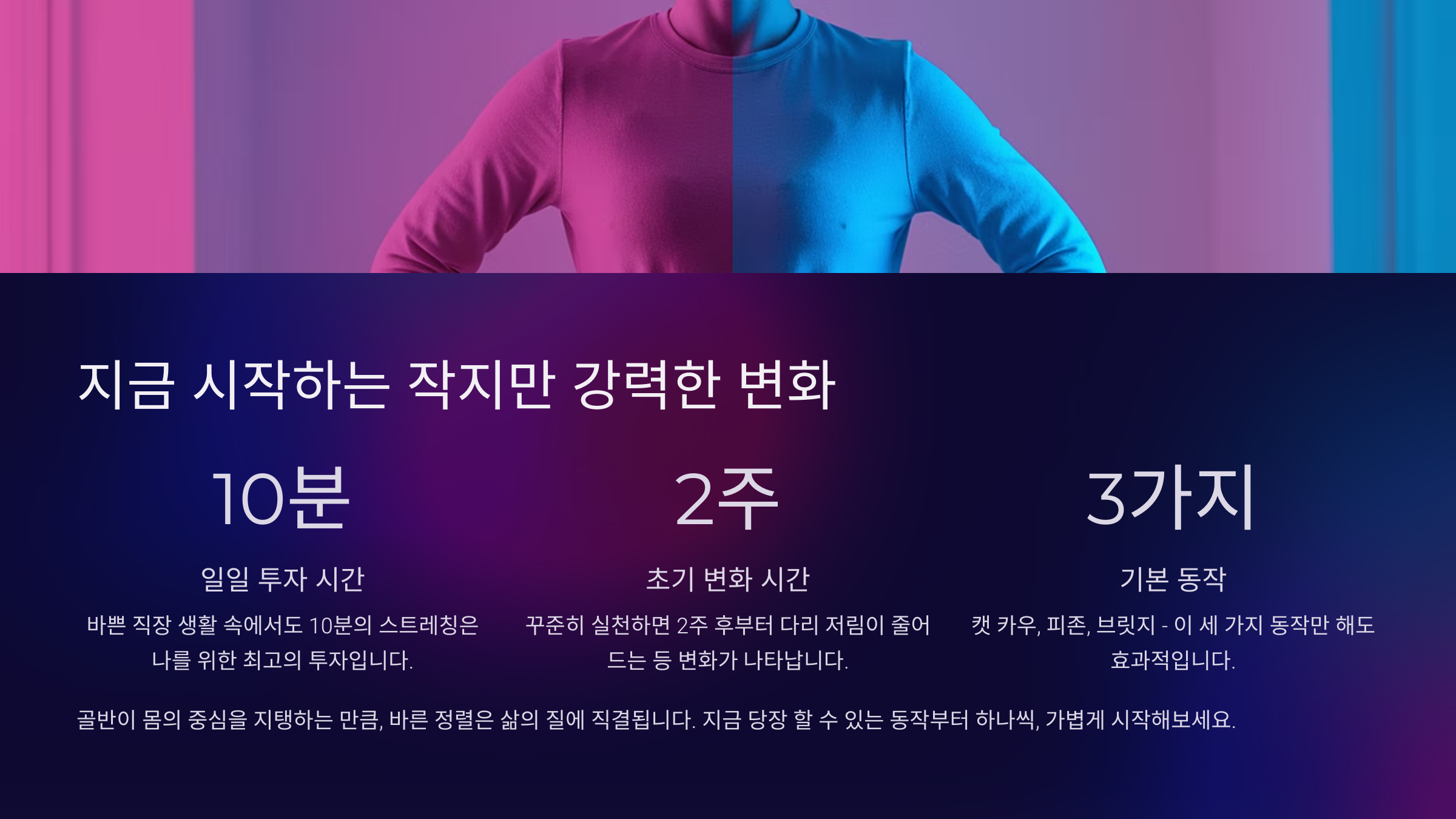 골반이 몸의 중심을 지탱하는 만큼, 바른 정렬은 삶의 질에 직결됩니다. 바쁜 직장 생활 속에서도 10분의 스트레칭은 나를 위한 최고의 투자입니다. 오늘 하루, 피곤한 몸을 잠시 내려놓고 내 몸을 바로 세워보세요. 그 첫걸음이 내일의 통증을 줄이고, 더 활기찬 삶을 열어줄 것입니다.