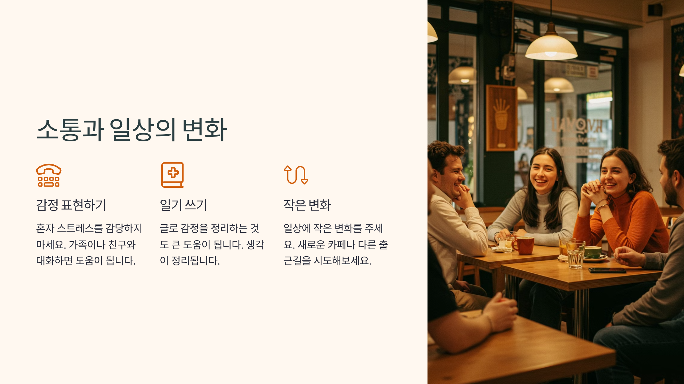 혼자 스트레스를 감당하기보다 주변 사람들과 나누는 것이 중요해요. 가족이나 친구와 대화하거나, 일기를 쓰면서 감정을 정리하는 것도 큰 도움이 돼요.