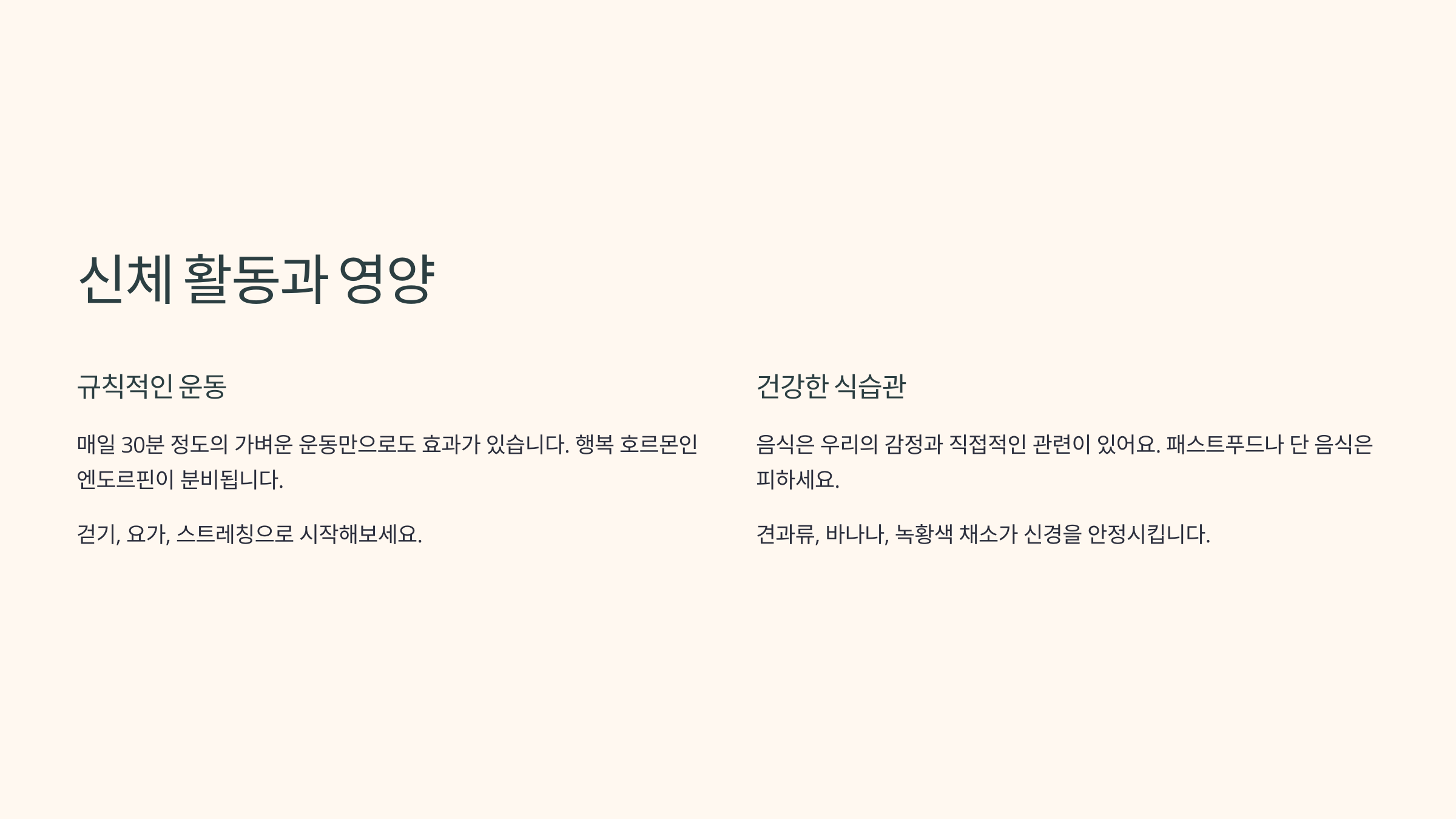 운동은 스트레스 해소에 가장 효과적인 방법 중 하나예요. 몸을 움직이면 행복 호르몬인 엔도르핀이 분비되어 기분이 좋아지고, 스트레스에 대한 저항력도 높아져요. 매일 30분 정도의 가벼운 운동(걷기, 요가, 스트레칭)만 해도 큰 도움이 된답니다.