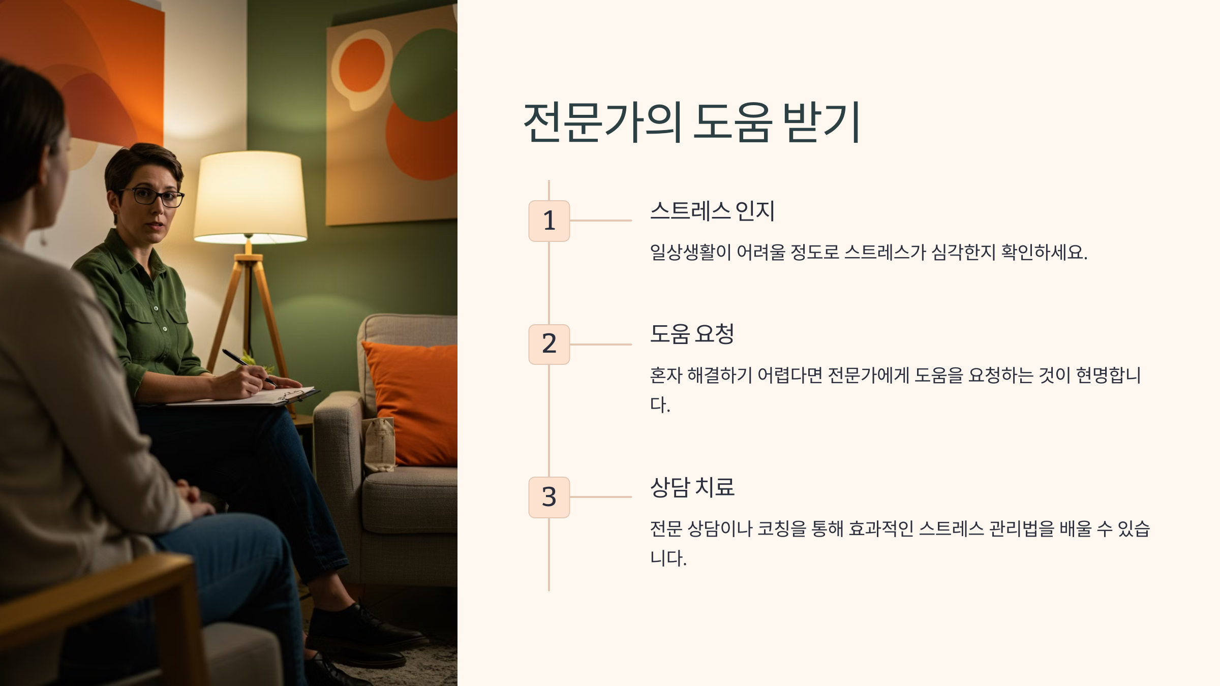 스트레스가 너무 심해 일상생활이 힘들다면 전문가의 도움을 받아보는 것도 좋아요. 상담 치료나 코칭을 통해 문제를 해결하는 방법을 배울 수 있어요.