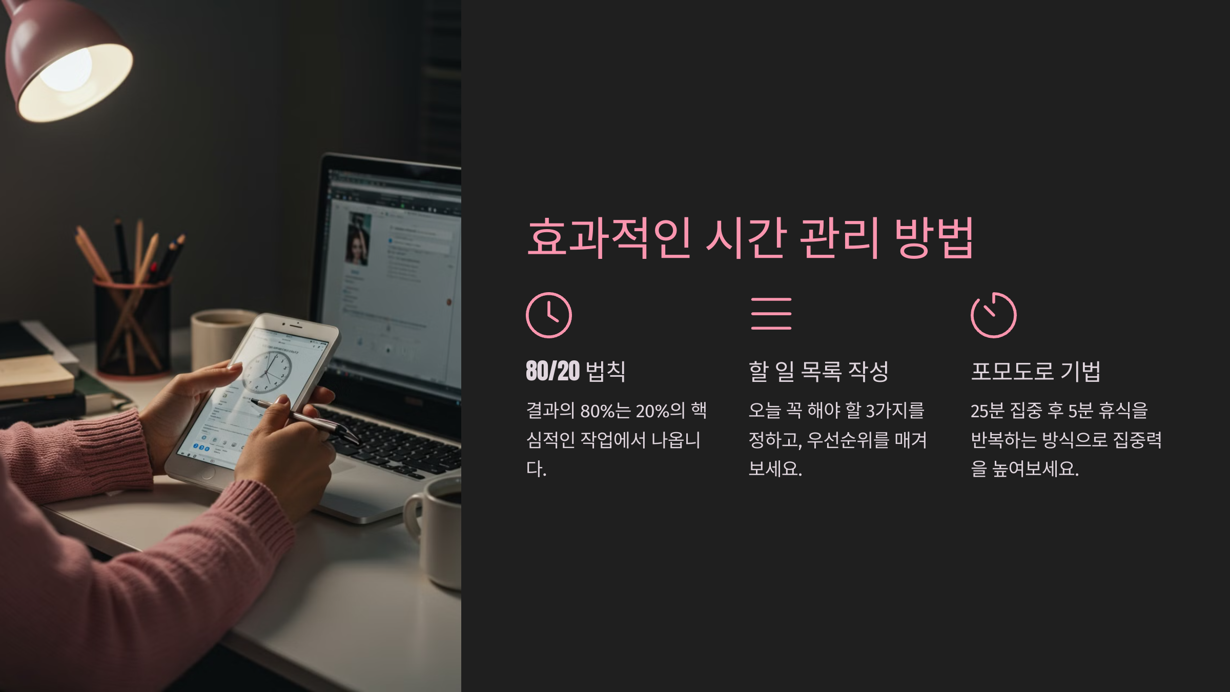 이렇게 하면 일을 더 효율적으로 끝내고 남은 시간은 개인 생활에 투자할 수 있어요!