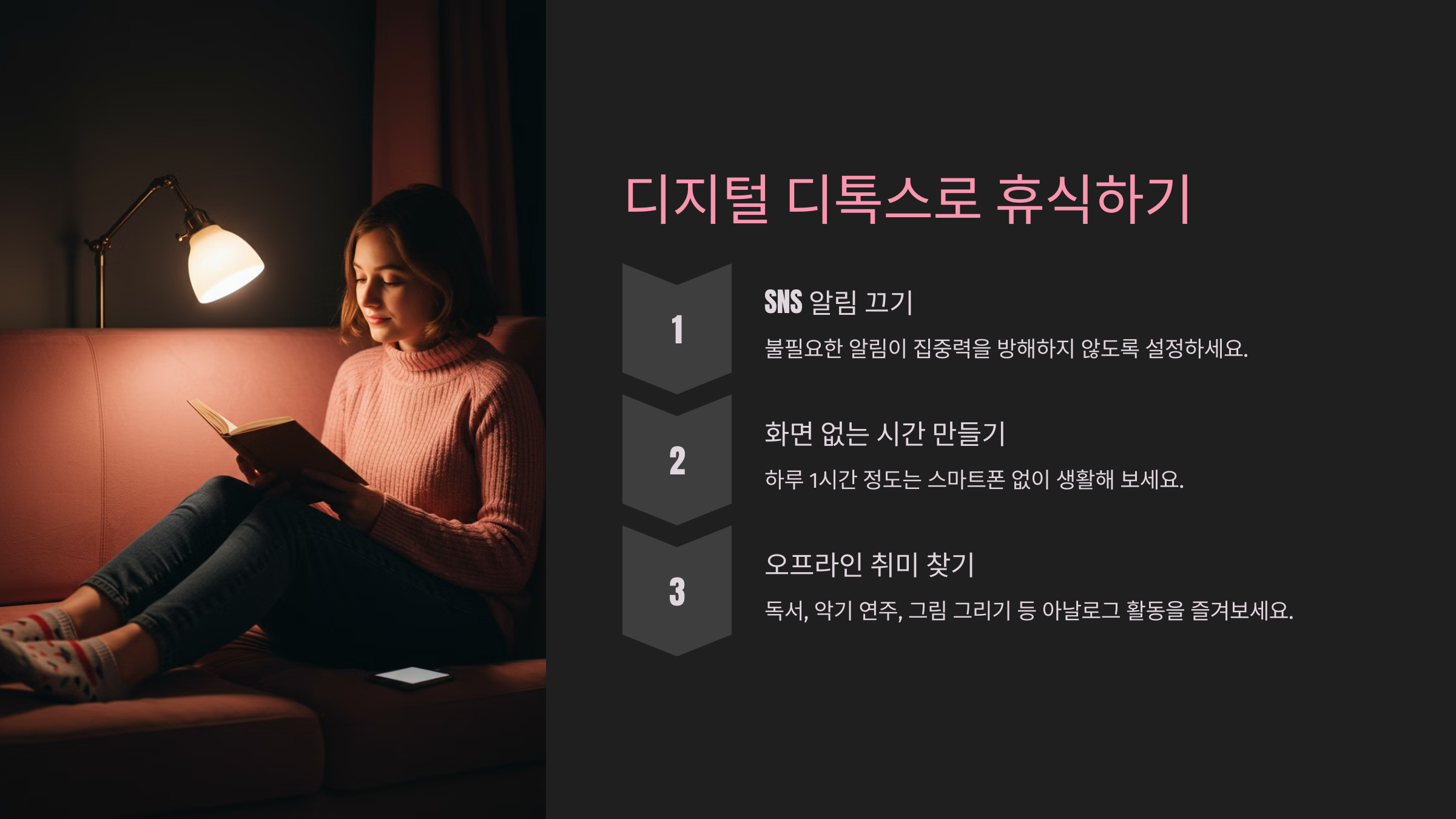 📵 화면 없는 시간 만들기 – 하루 1시간 정도는 스마트폰 없이 생활해 보세요.