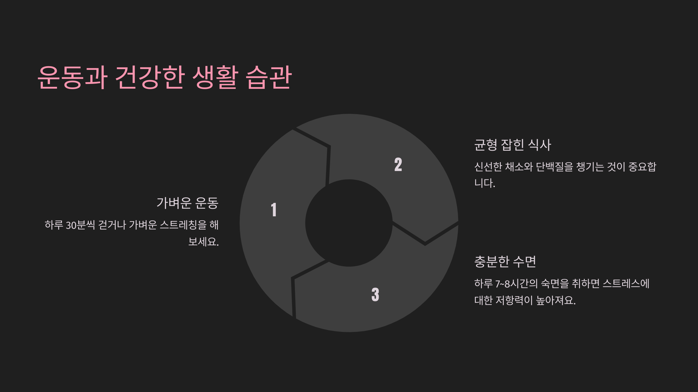 규칙적인 운동과 건강한 식습관은 스트레스 해소에 큰 도움이 됩니다.