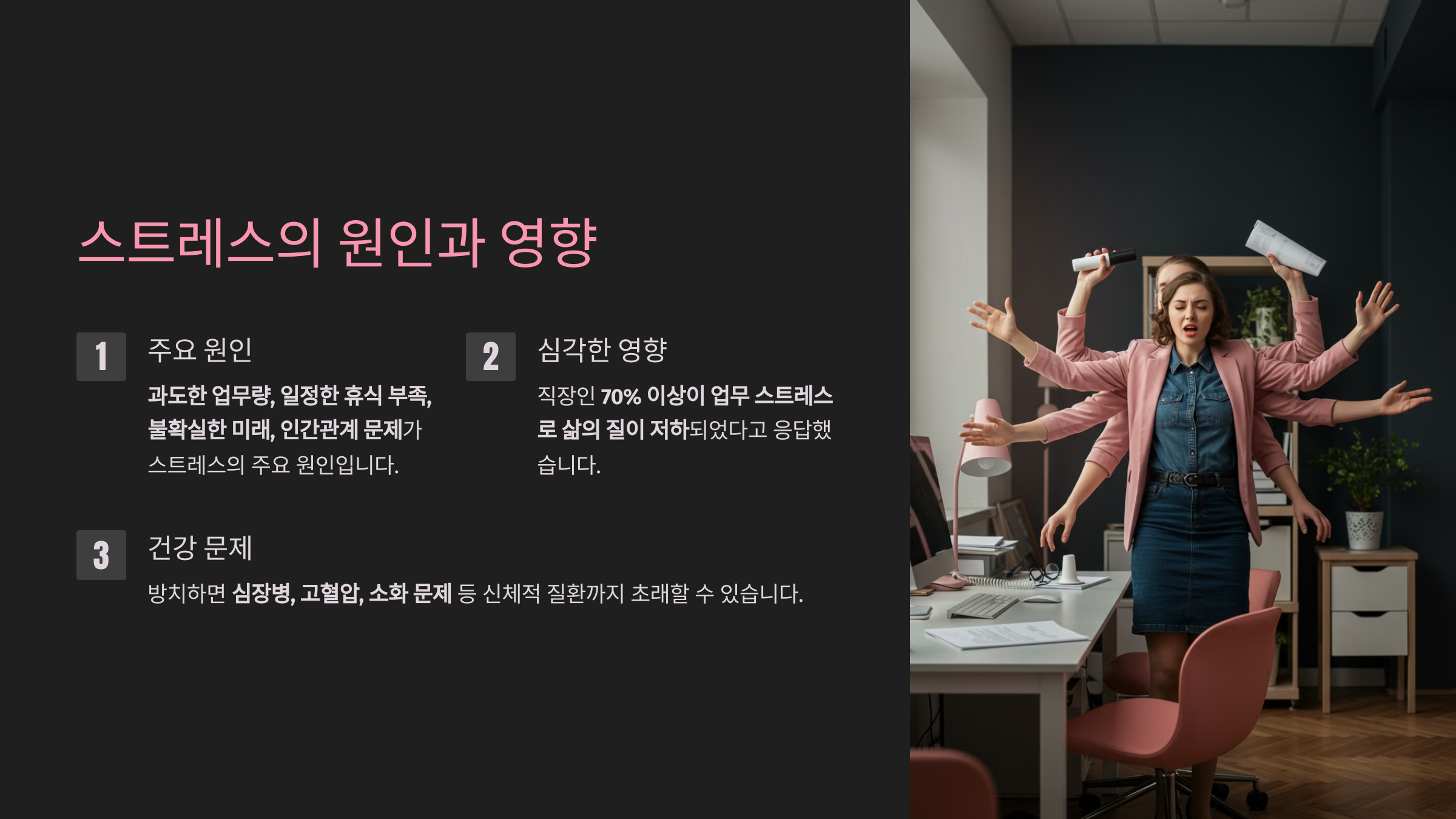 스트레스를 방치하면 심장병, 고혈압, 소화 문제 등 신체적 질환까지 초래할 수 있죠.