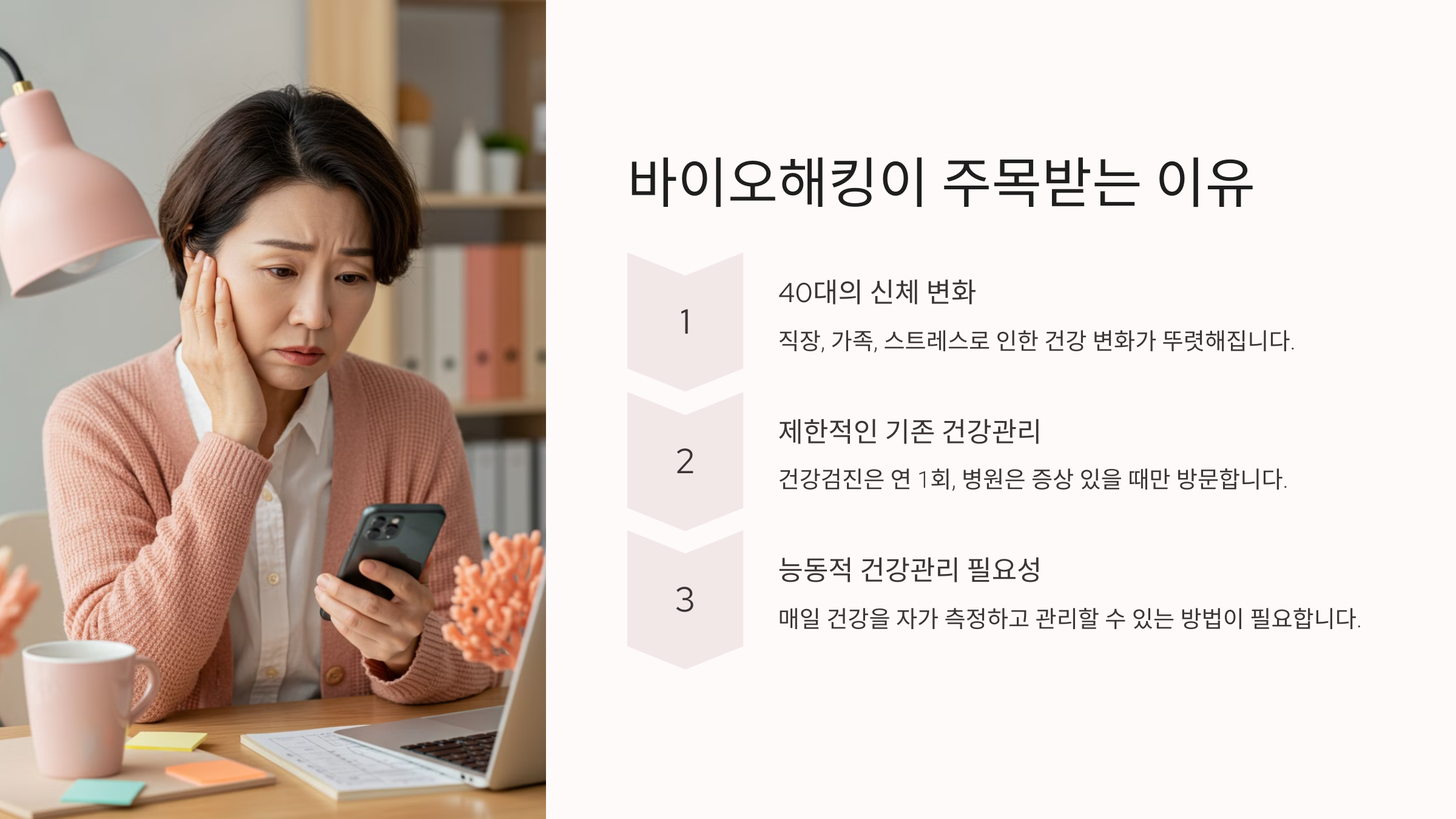 직장, 가족, 스트레스, 운동 부족… 40대에 접어들면 몸의 변화가 명확히 느껴집니다. 하지만 건강검진은 1년에 한 번, 병원은 증상 있을 때만 갑니다. 바이오해킹은 매일 건강을 자가 측정하고 관리할 수 있게 해주는 능동적 방법입니다. 이제 건강은 병원 아닌, ‘내 손안’에서 관리하는 시대가 된 것이죠.