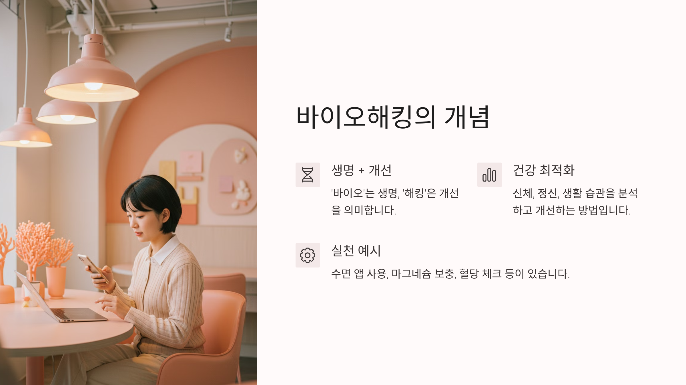‘바이오(Bio)’는 생명, ‘해킹(Hacking)’은 개선이나 변화를 뜻합니다. 즉, 바이오해킹은 신체, 정신, 생활 습관을 분석하고 개선하는 건강 최적화 방법입니다. 예: 수면 개선을 위해 수면 앱을 사용하고, 피로 해소를 위해 마그네슘을 보충하거나, 식사 전 혈당을 체크하여 맞춤 식단을 조절하는 것이 바이오해킹입니다.