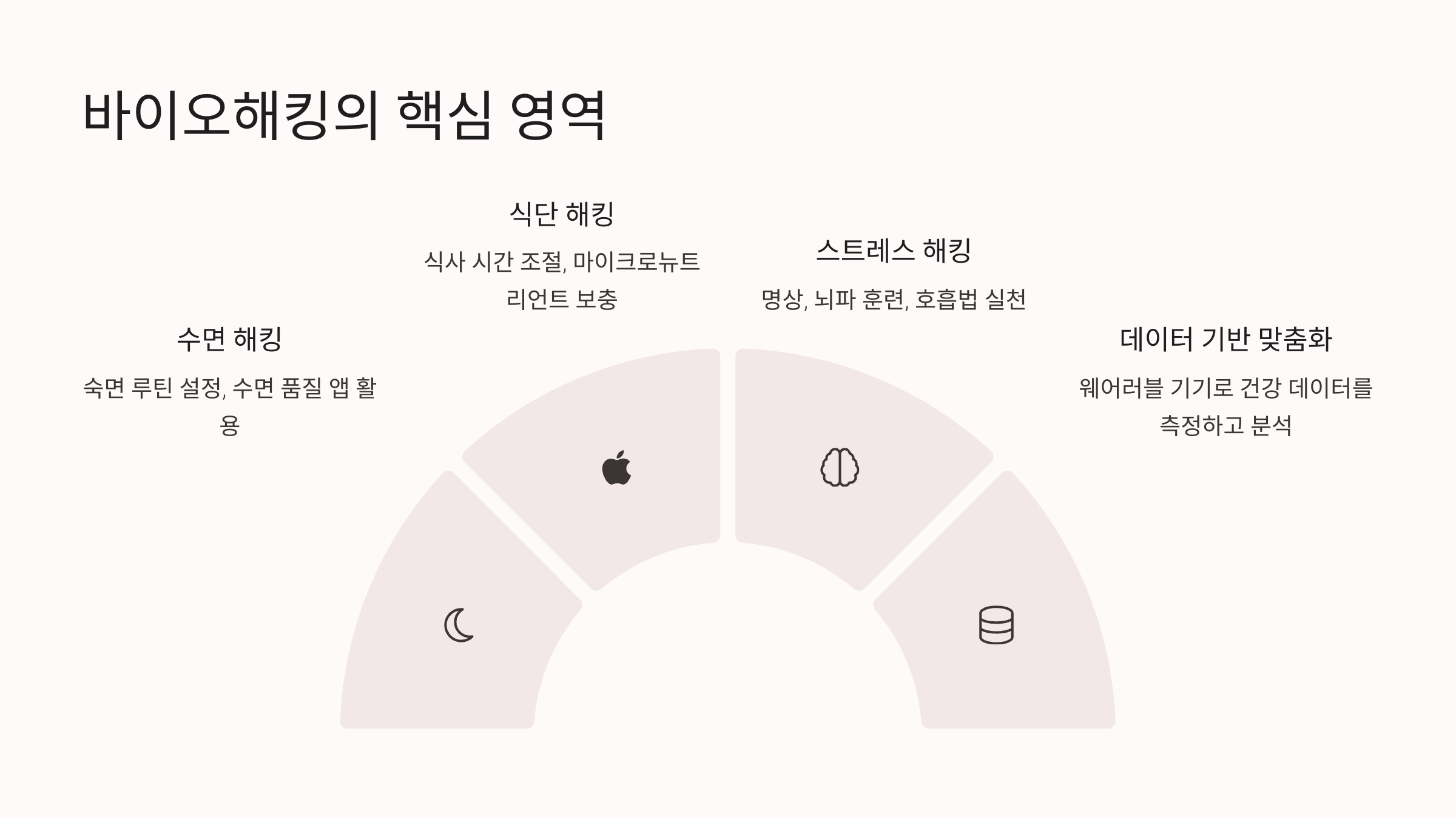 바이오해킹의 출발점은 ‘수면’과 ‘식단’ 그리고 ‘정신 건강’입니다. • 수면 해킹: 숙면 루틴 설정, 수면 품질 앱 활용 • 식단 해킹: 식사 시간 조절, 마이크로뉴트리언트 보충 • 스트레스 해킹: 명상, 뇌파 훈련, 호흡법 실천 이 3가지가 기본이자 가장 중요한 영역입니다.