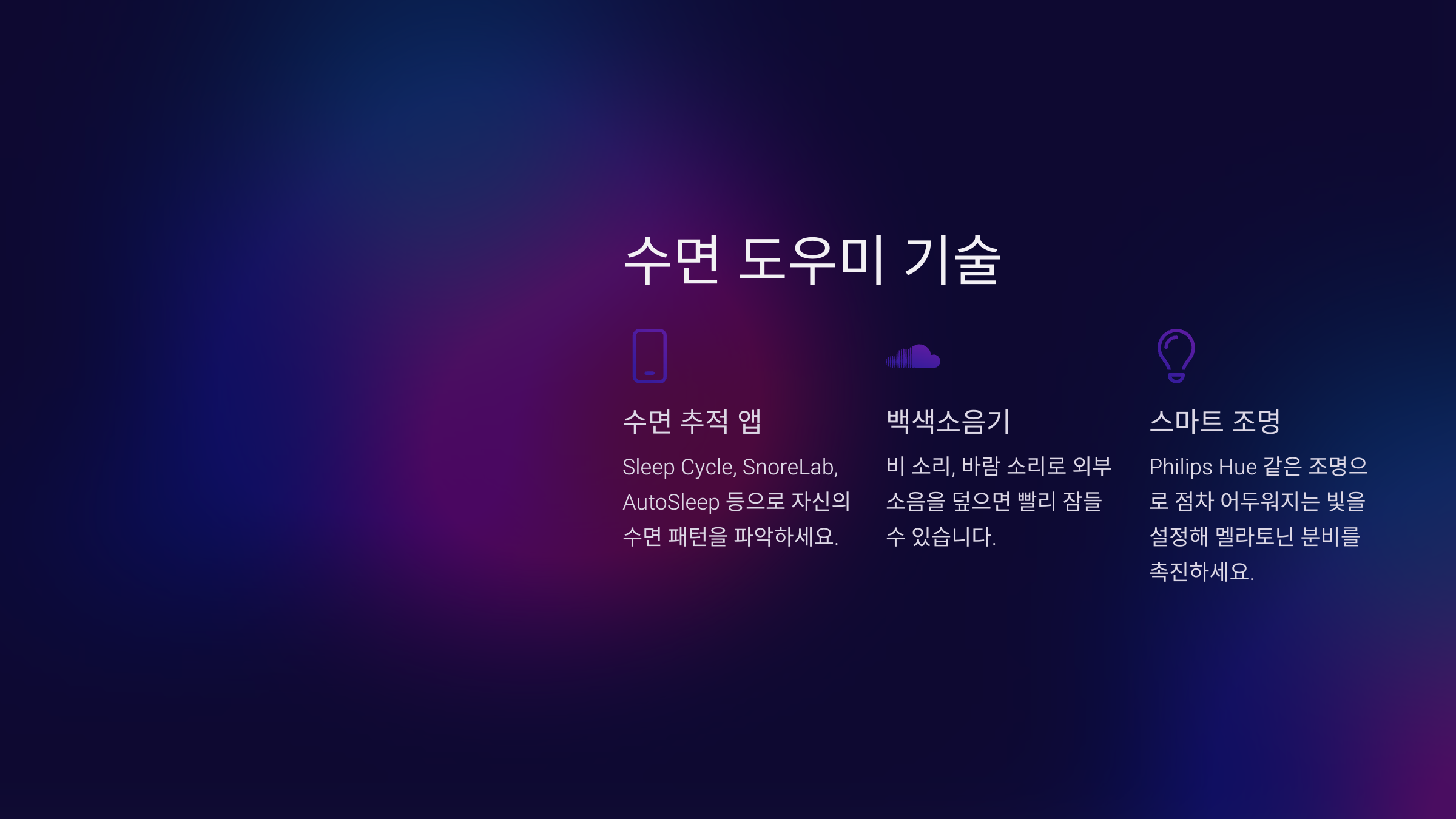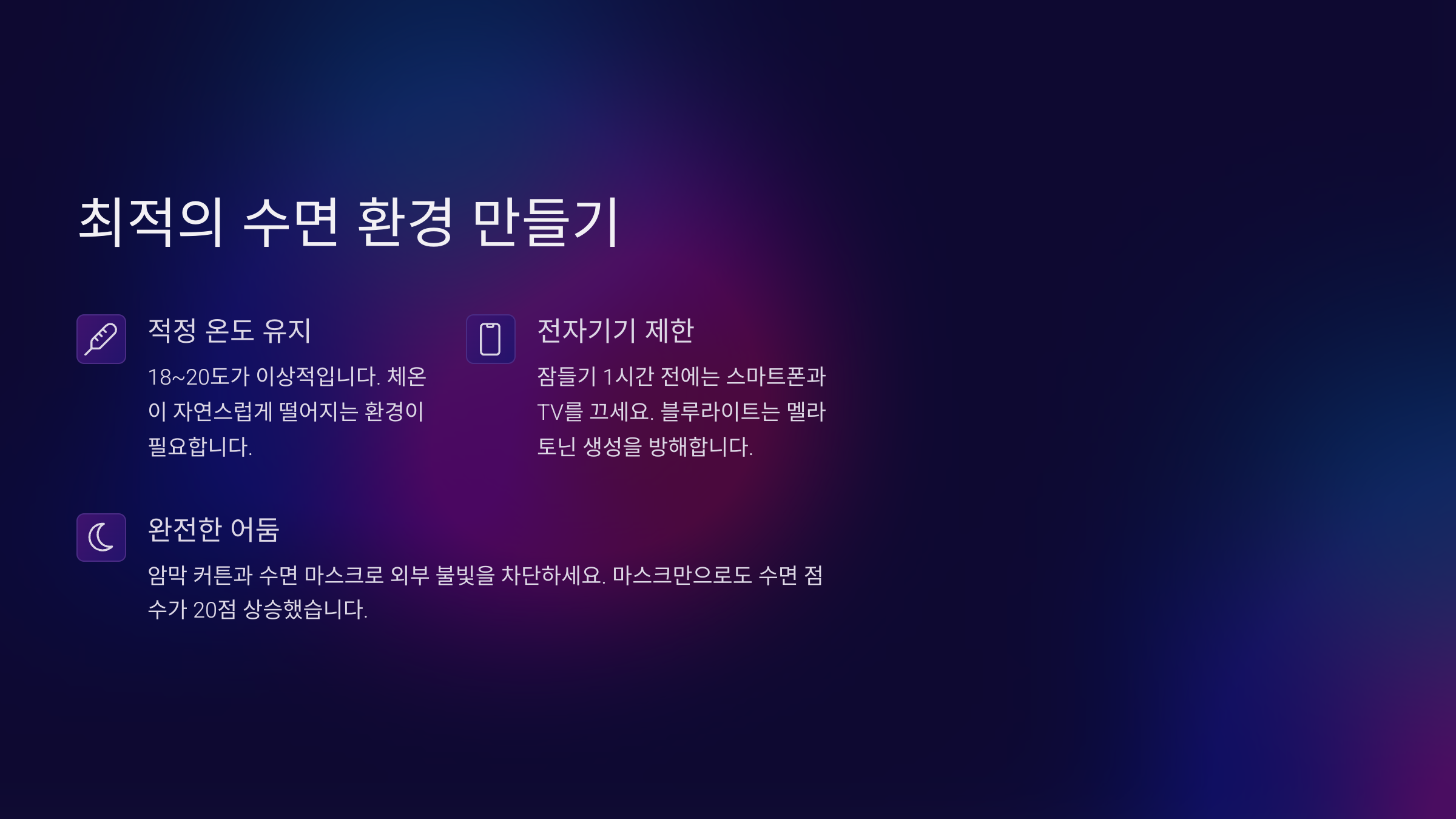 Philips Hue나 국내 스마트 조명 앱을 활용해 점차 어두워지는 빛을 설정해 보세요. 실제 실험 결과, 이러한 조명이 멜라토닌 분비를 촉진해 자연스러운 졸음을 유도합니다.