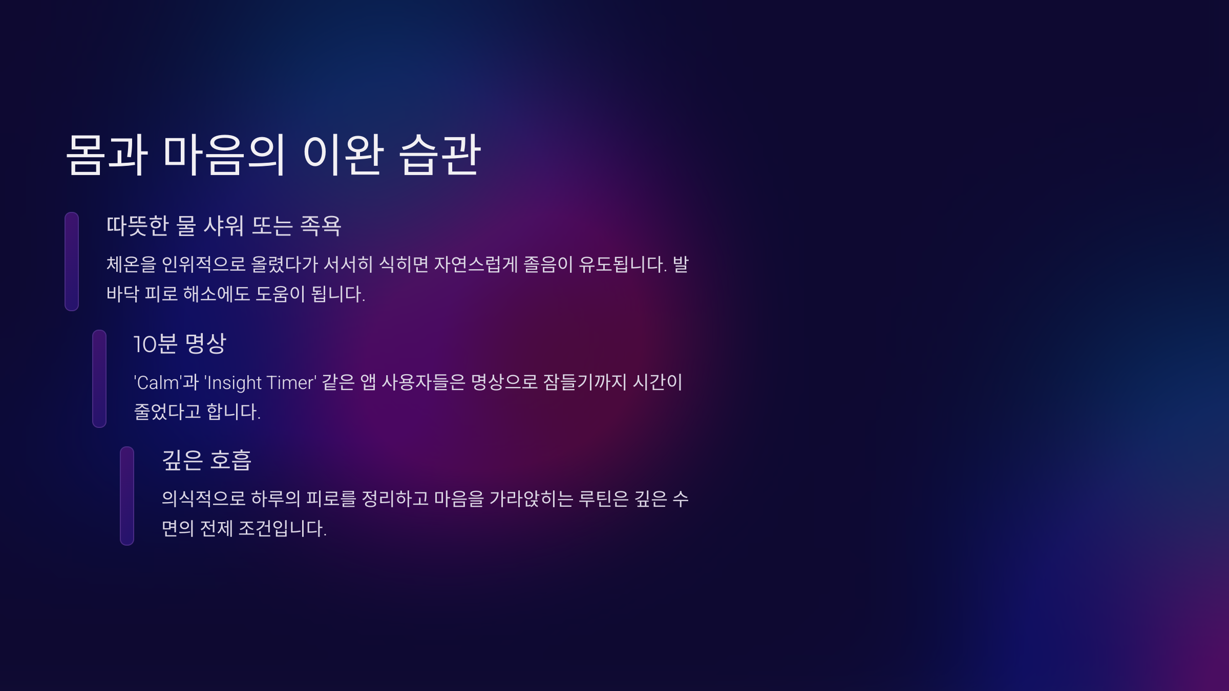 최근 'Calm'과 'Insight Timer' 같은 앱 사용자 리뷰에서 "10분 명상만으로 잠들기까지 걸리는 시간이 확 줄었다"는 반응이 많았습니다. 의식적으로 하루의 피로를 정리하고 마음을 가라앉히는 루틴은 깊은 수면의 전제 조건입니다.