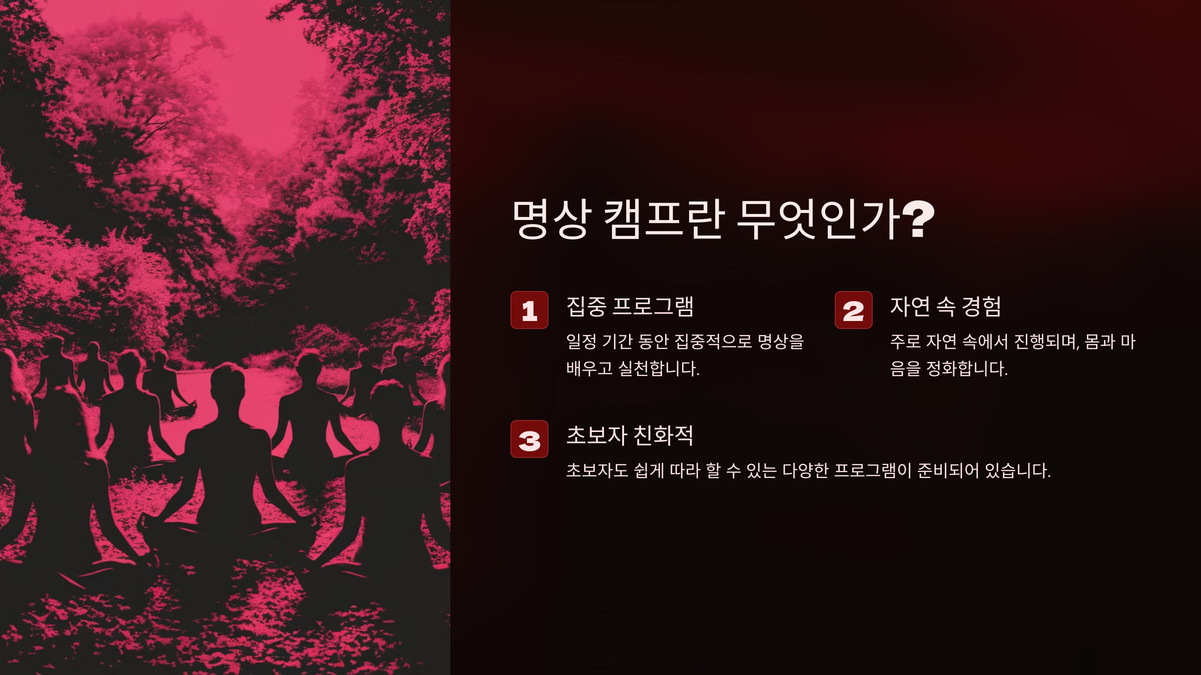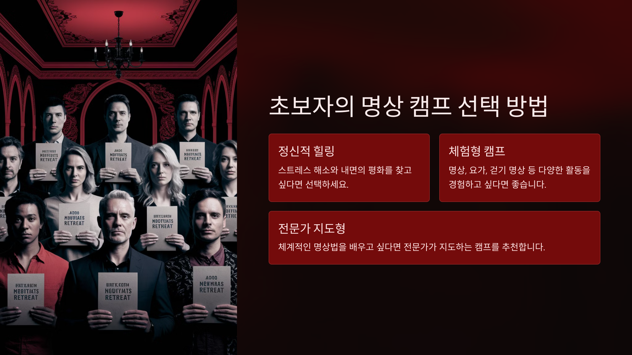 ✅ 전문가 지도형: 체계적인 명상법을 배우고 싶다면 전문가가 지도하는 캠프를 추천!